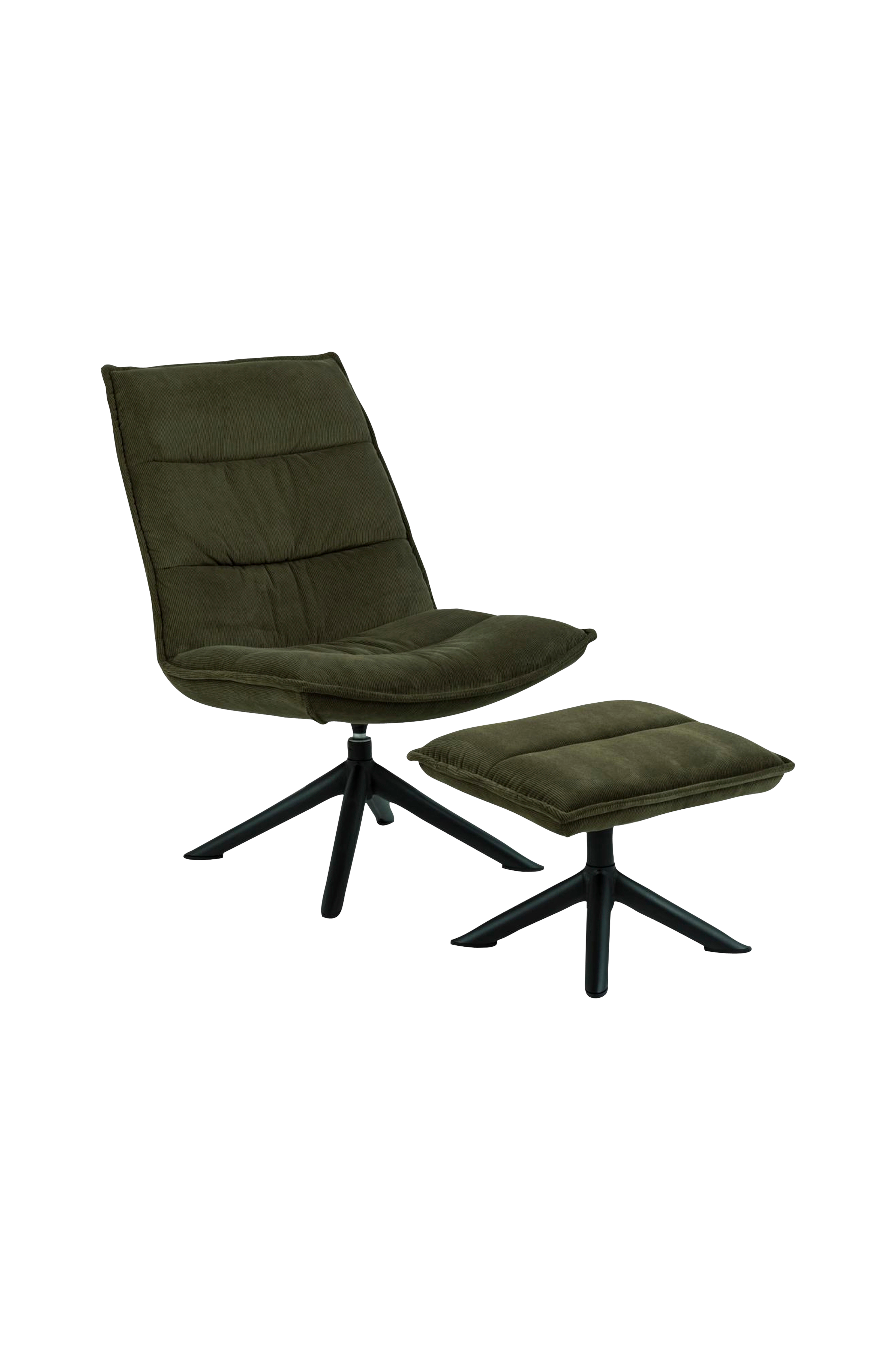 Tänk retro och möbeldesign från 1980-talet - kombinera det, lägg till lite moderna vibbar och strö med fina detaljer. Voilà, du har en trendig loungestol med ett modernt uttryck som fortfarande påminner om 1980-talets fantastiska retrodesign. Loungestolen är klädd med ett beige manchestertyg som framhävs med horisontella sömmar. Den har både snurrfunktion och en fotpall. Mått; Fåtölj bredd, 70, djup 112, höjd 98 cm. Fotpall 42x57, höjd 42 cm.