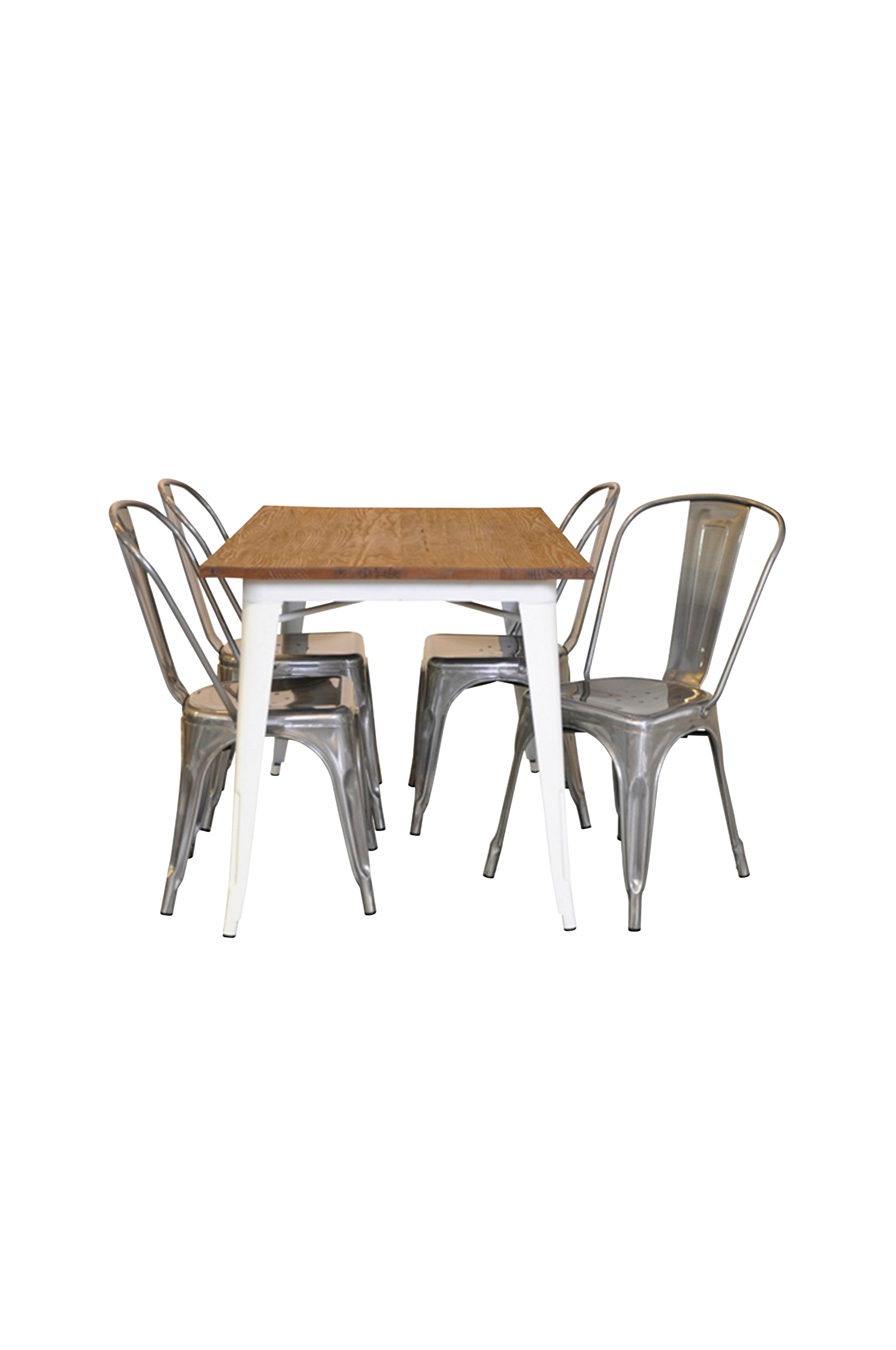 Detta franskinspirerade set består av ett bord med en skiva i rustik, grov plåt. Detta inkluderar 4 stolar i plåt.