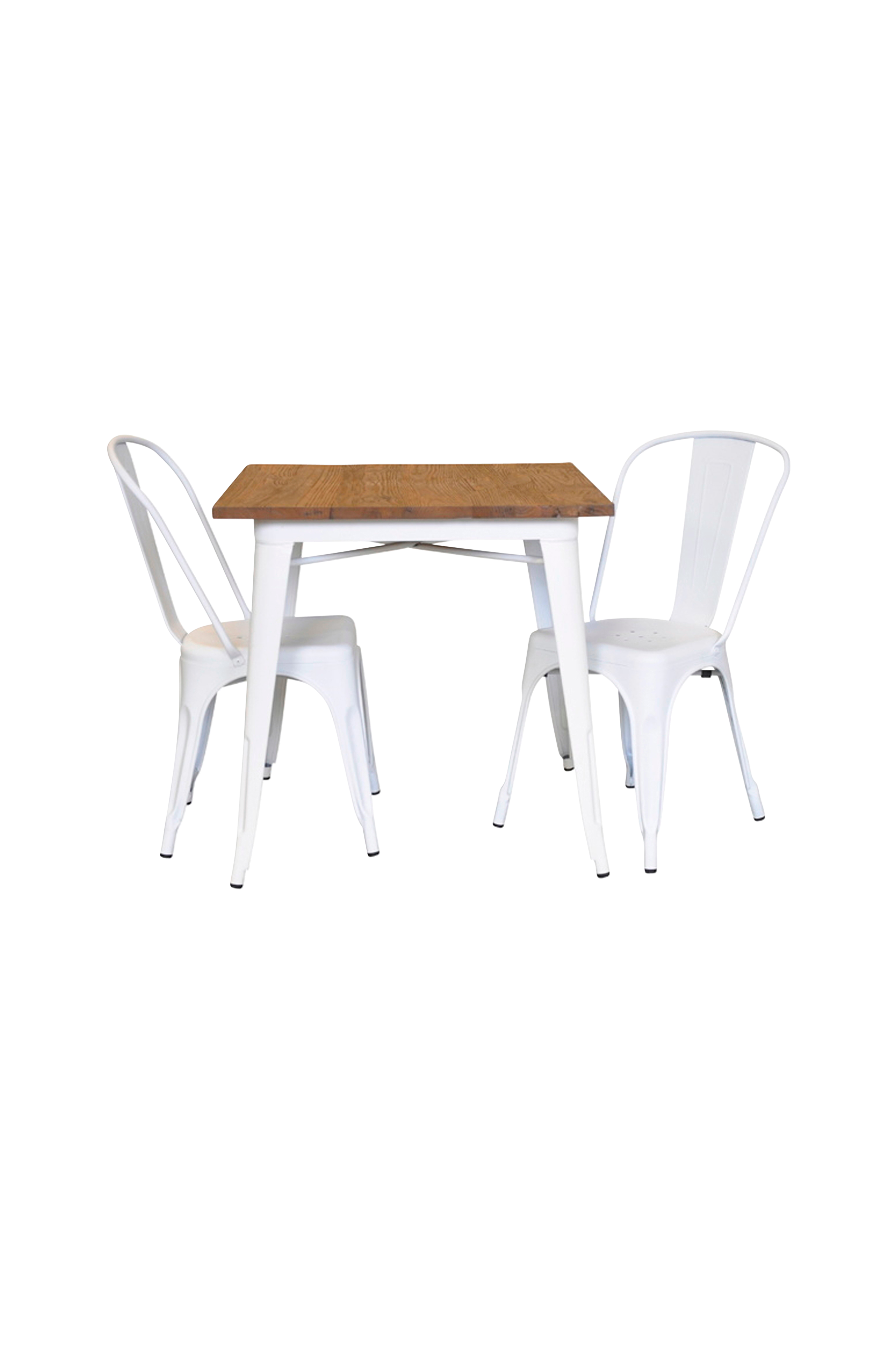 Detta franskinspirerade set består av ett bord i matt vit plåt med en skiva i rustik, grov metall. Detta inkluderar 2 metallstolar.