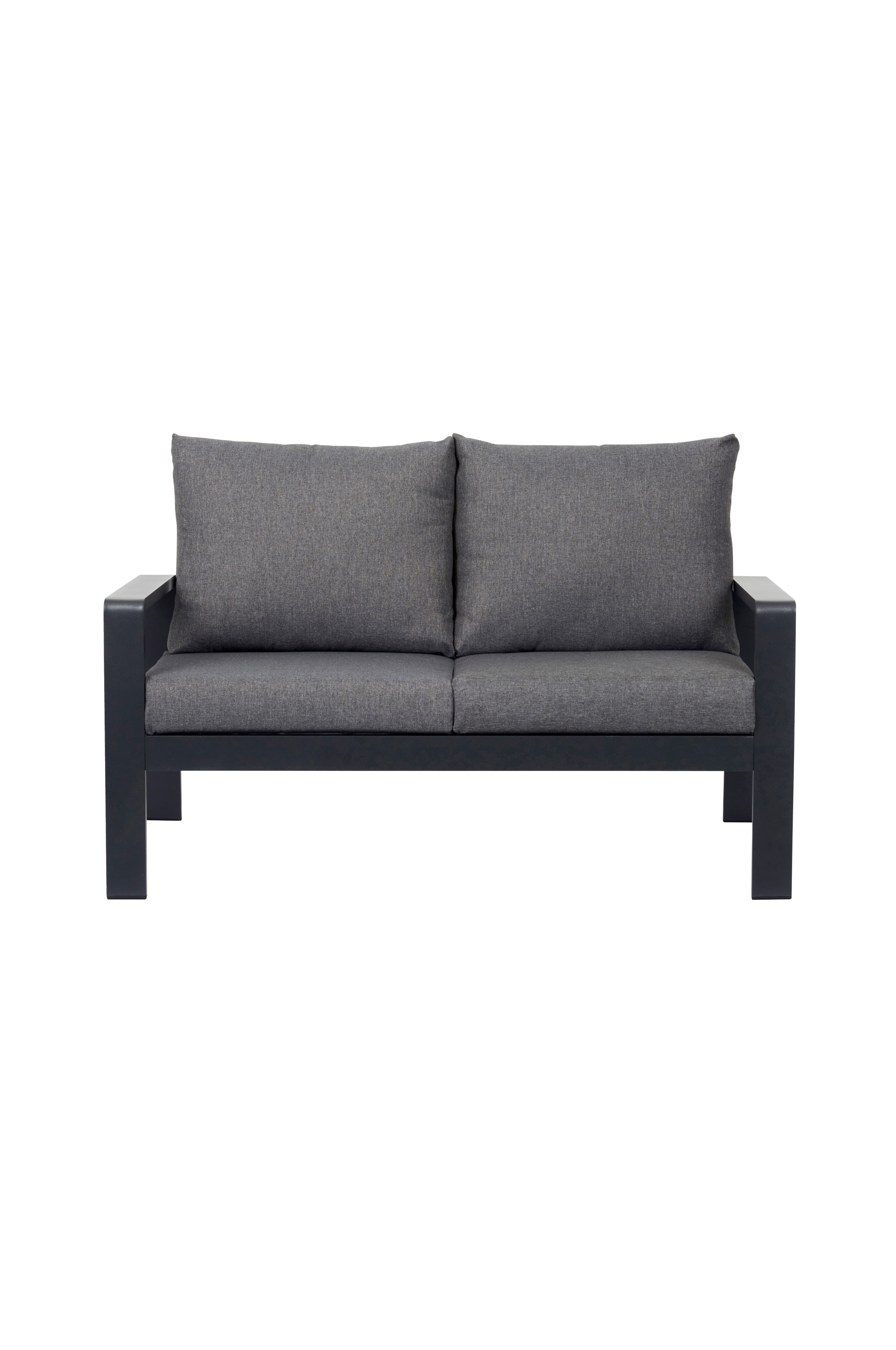Denna soffa har en ram i aluminium med långa platta ytor. Soffan är perfekt för loungesetet och med sin enkla form passar den i de flesta konfigurationer. Ramen är svart med kuddar i mörkgrå vattenavvisande polyester som är sköna att sitta på.