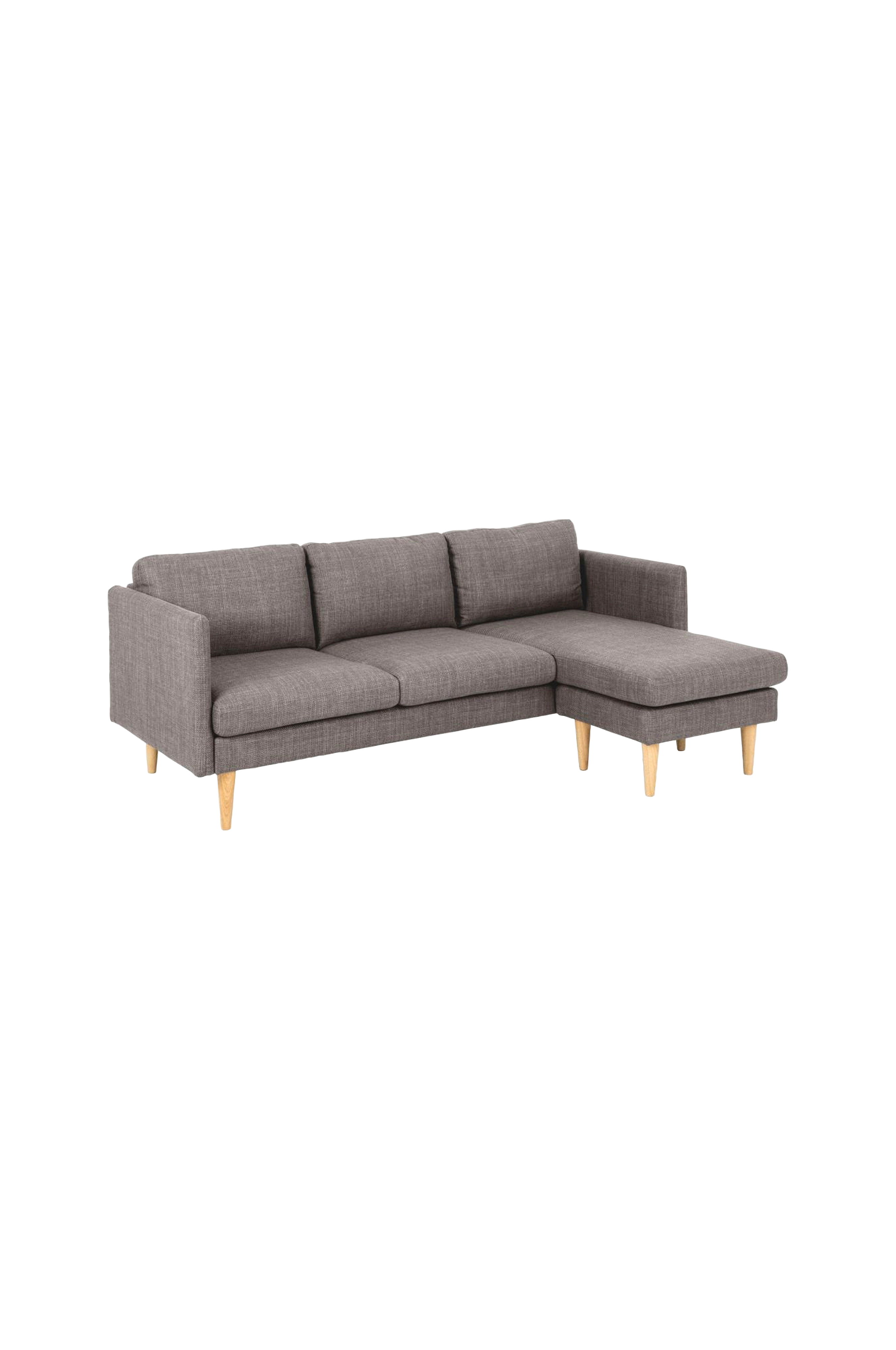 Varje hem förtjänar en bekväm och praktisk soffa som den här. Den levereras med pocketfjädrar för ökad komfort och en schäslong. I det här fallet behöver du inte välja sida - du kan byta sida som du vill tack vare den fasta, vändbara schäslongen. Soffan är klädd i ett ljusgråbrunt tyg med en tvåfärgad effekt, vilket ger klädseln ett snyggt utseende. Den matchas med avsmalnande ekbetsade träben för en lätt och modern look.