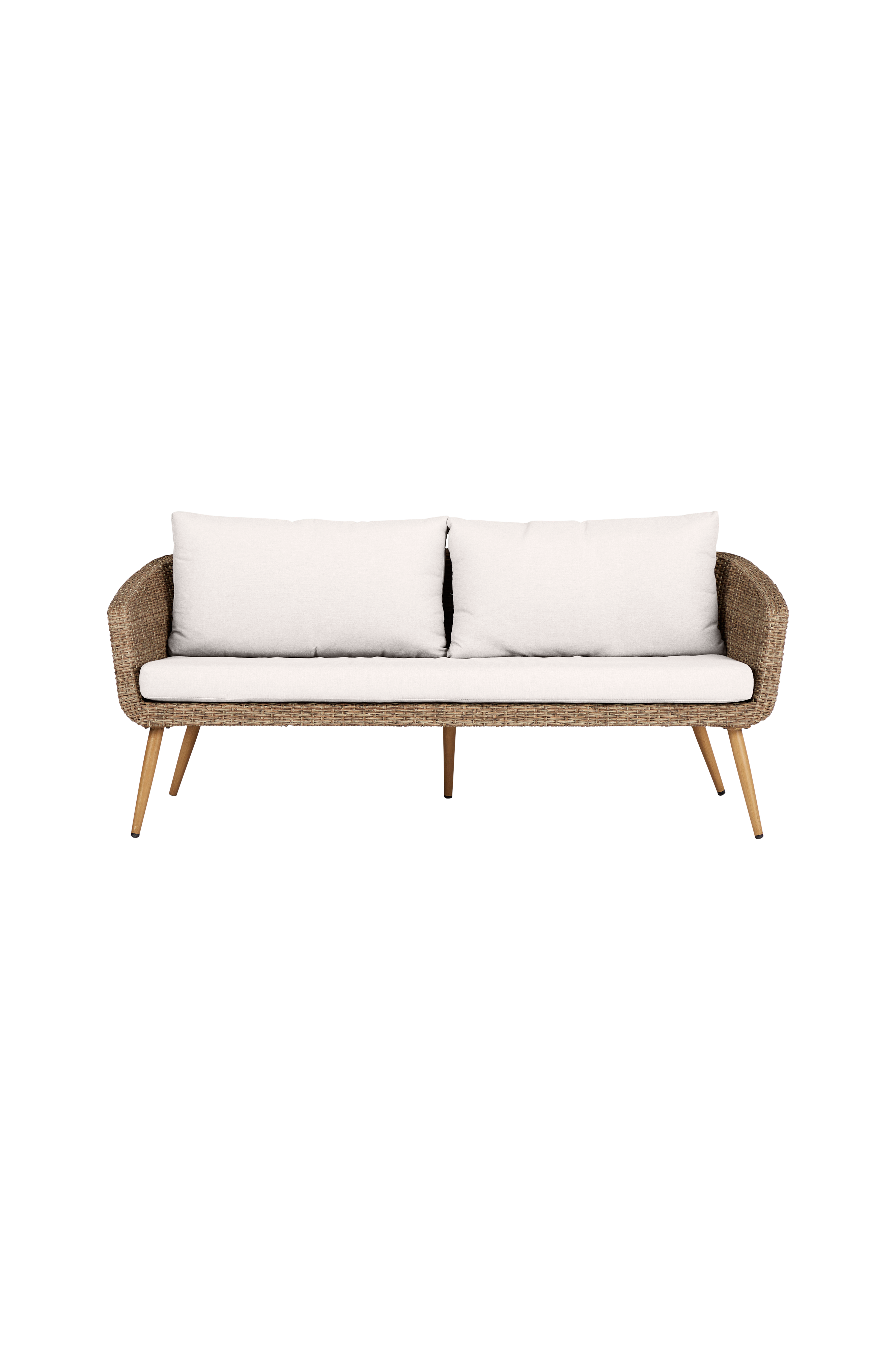 3-sitssoffa med kuddar och aluminiumben i träfärg. Soffan är stilfull med handvävd polyrotting och en stomme av aluminium. Väven täcker hela stommen och ger en i övrigt enkel konstruktion några fina detaljer som passar in i de flesta sittgrupper. Polyrotting är ett fantastiskt material som är resistent mot mögel och fukt. Kuddarna är gjorda av polyester och är vattenavvisande.