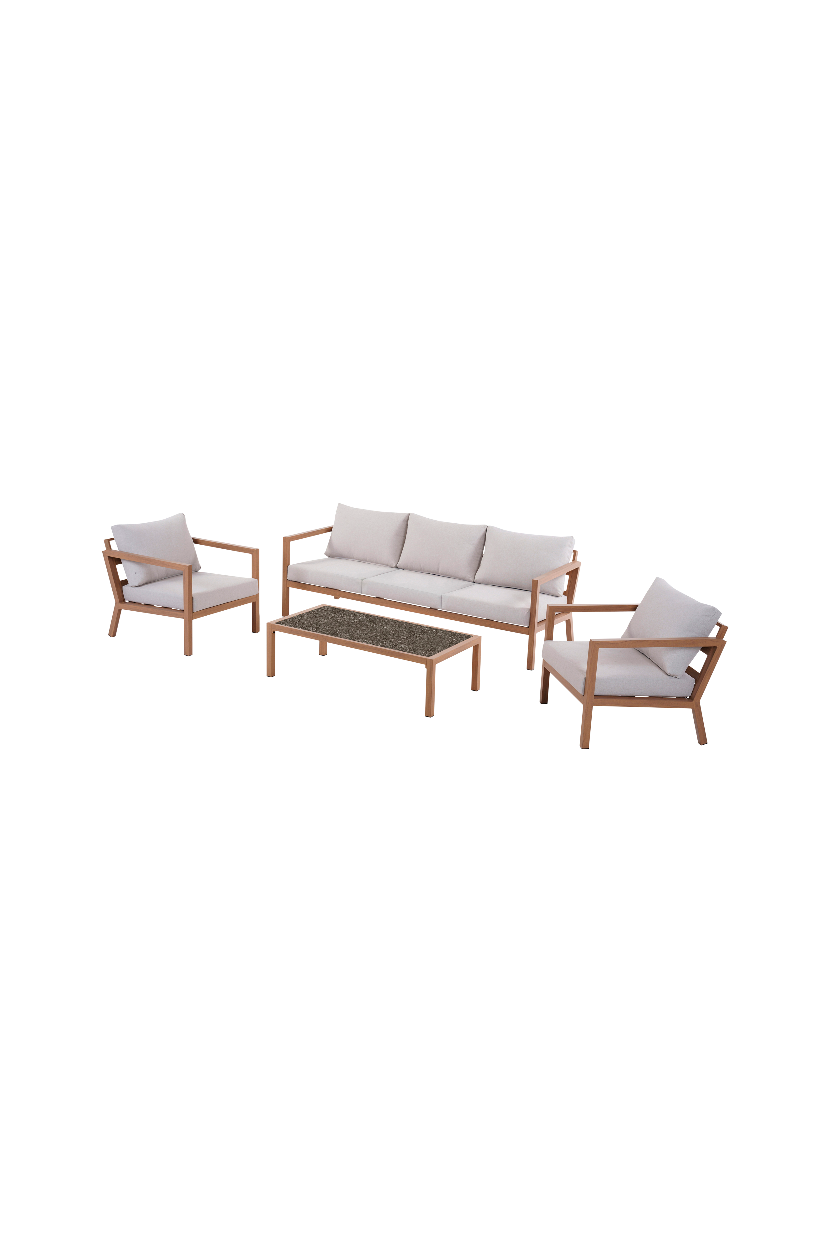 Soffgrupp i fyra delar med dynor. Stommen är gjord av aluminium i en klassisk konstruktion som ser ut att vara byggd av trä. Stommen är belagd med en träfärg som ger hög hållbarhet och ett naturligt utseende. Träfärgen passar fint med dynorna i ljusgrå naturfärg. Bordsskivan är belagd med Spraystone™, vilket ger en snygg och robust yta som liknar sten. Setet är underhållsfritt, men vi rekommenderar att du använder ett överdrag eller tar in möblerna under vintern, samt tar in dynorna när det regnar.