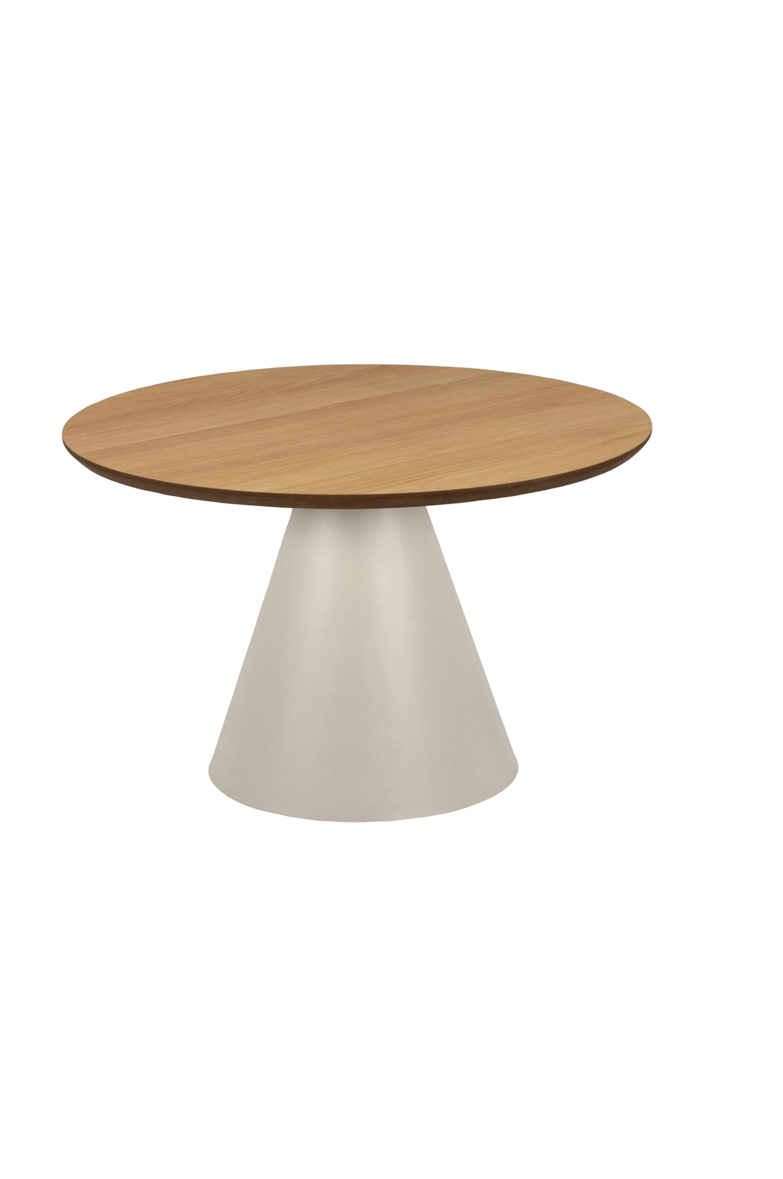Detta runda soffbord skapar en visuell intrig och kommer att lyfta soffområdet med sitt subtila uttryck. Designen kombinerar industriella och naturliga element och framkallar en känsla av balans och harmoni. Den koniska pelarbasen, tillverkad av stål, verkar mjukare för ögat när den kombineras med en rund topp i lackerad ekfanér.