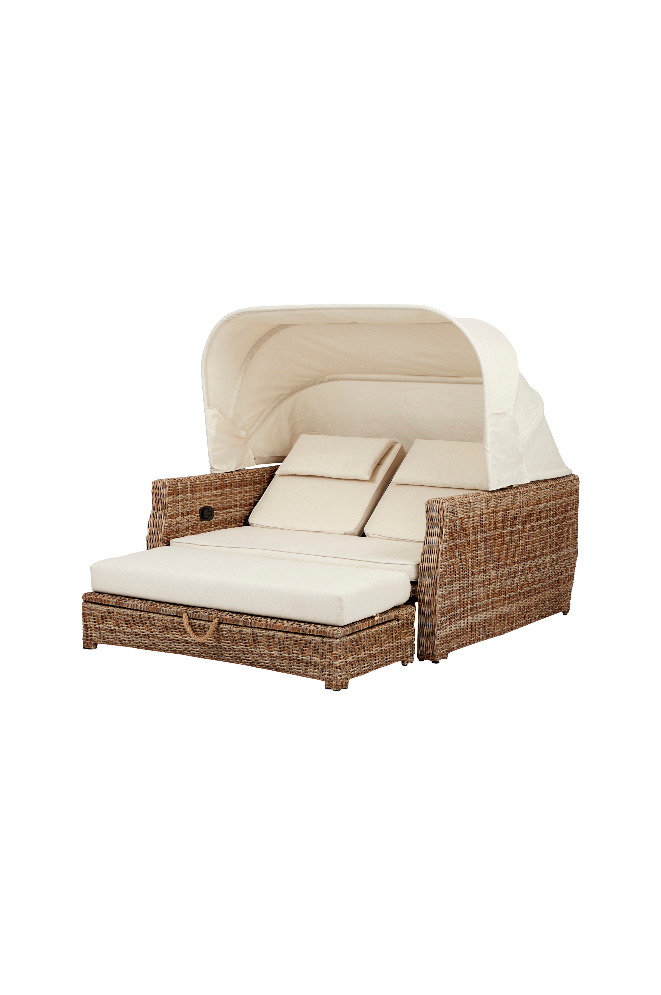 Upplev symbolen för mysig lyx med vårt kärleksnäste. Denna innovativa design (b150xd141/202xh80cm) har mångsidighet och stil. Med en bekväm sitthöjd på 37 cm och 7 cm tjocka dynor av 230 g/m2 polyester är det här din personliga oas. Justera kärleksnästet till två olika lägen för att passa ditt humör. Tillverkad av slitstark halvrund rotting och polyestertyg, den är byggd för att hålla länge. Kd-modellen säkerställer enkel förvaring. Setet innehåller en sittdyna på 130x58x7 cm, en ryggdyna på 62x60x7 cm och en ottoman på 125x52x13 cm för ultimat avkoppling. Skapa oförglömliga stunder i detta mysiga kärleksnäste - det är där komfort och stil möts.