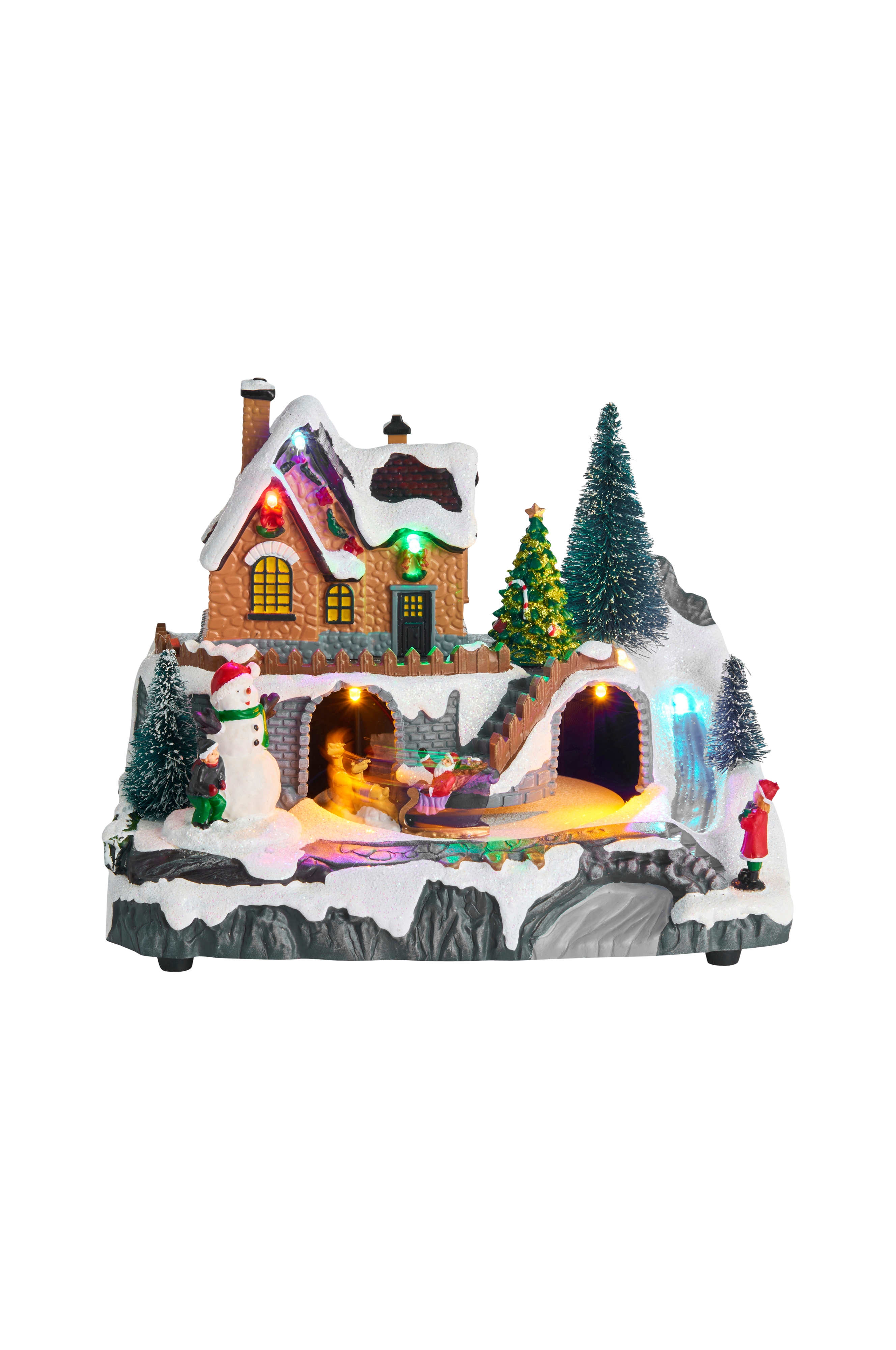 Julstad med slädtur. Denna vackra dekoration ger dig inte bara tomten, utan också hans släde, renar och presenter direkt i ditt vardagsrum, där han sitter och sprider glädje till julmusik. Har 8 melodier och 7 LED-lampor. Drivs av tre AA-batterier (ingår ej).