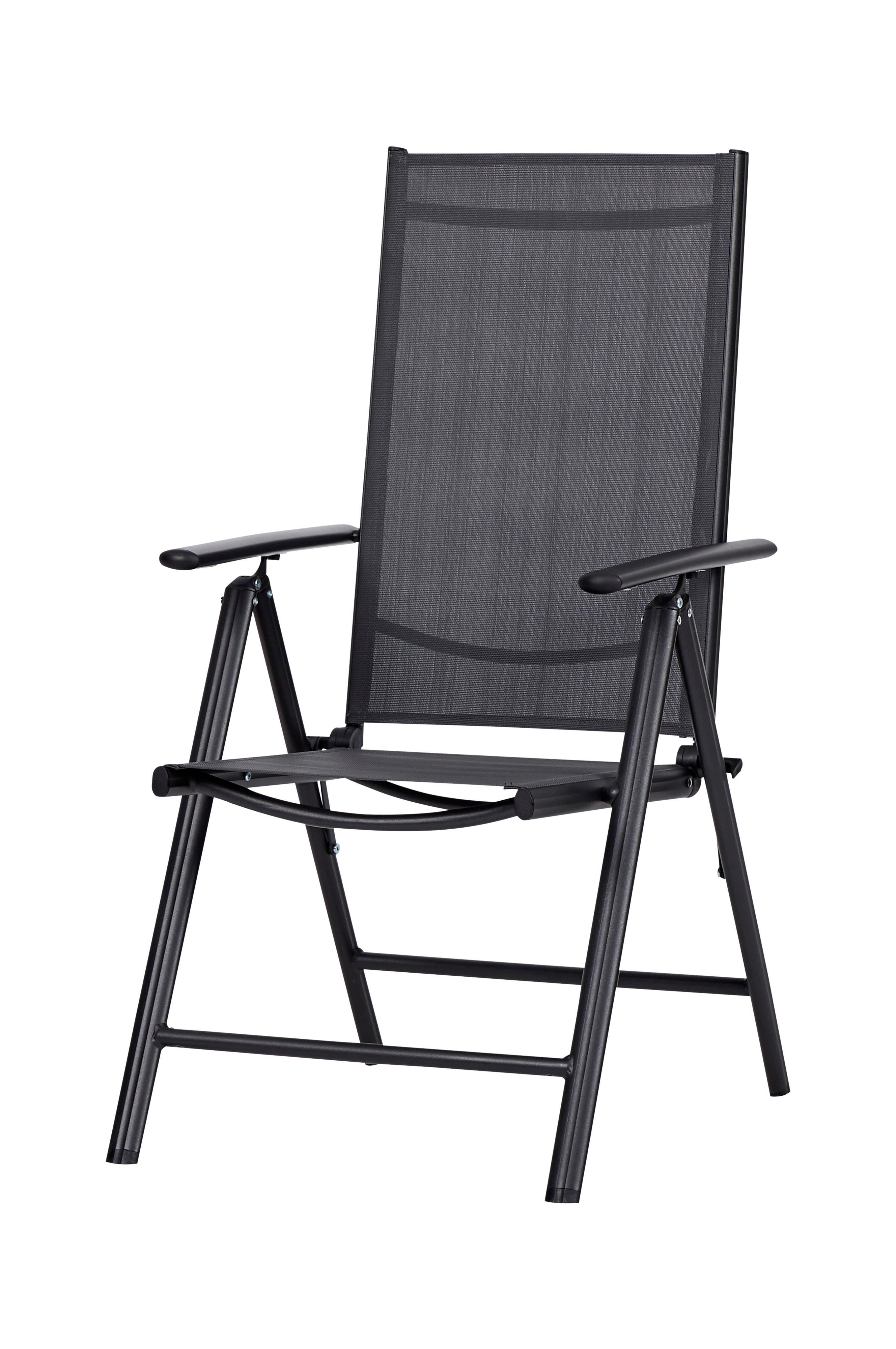 Trädgårdsstol med svart stomme av aluminium och svart sits av kraftigt meshmaterial. Meshmaterialet är bekvämt att sitta på och ingen stolsdyna behövs. Stolen är enkel att fälla ihop och passar perfekt för gäster. Den har även en steglös funktion som gör att du nästan kan ligga raklång.