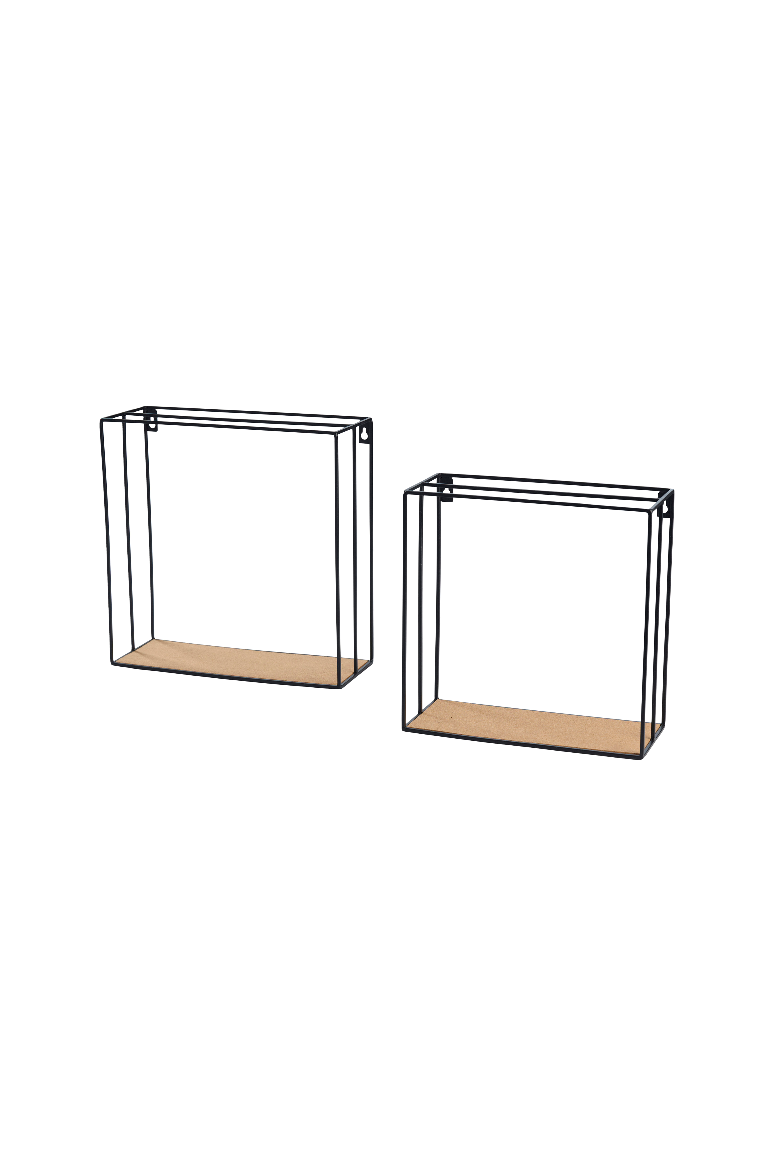 Vägghyllor med enkel, stilren design med svarta metallstänger och kontrasterande korkbotten. Hyllorna skapar ett snyggt blickfång för vad du än ställer på dem och kan med fördel monteras på väggen med en liten förskjutning, vilket ger en fin dynamik.