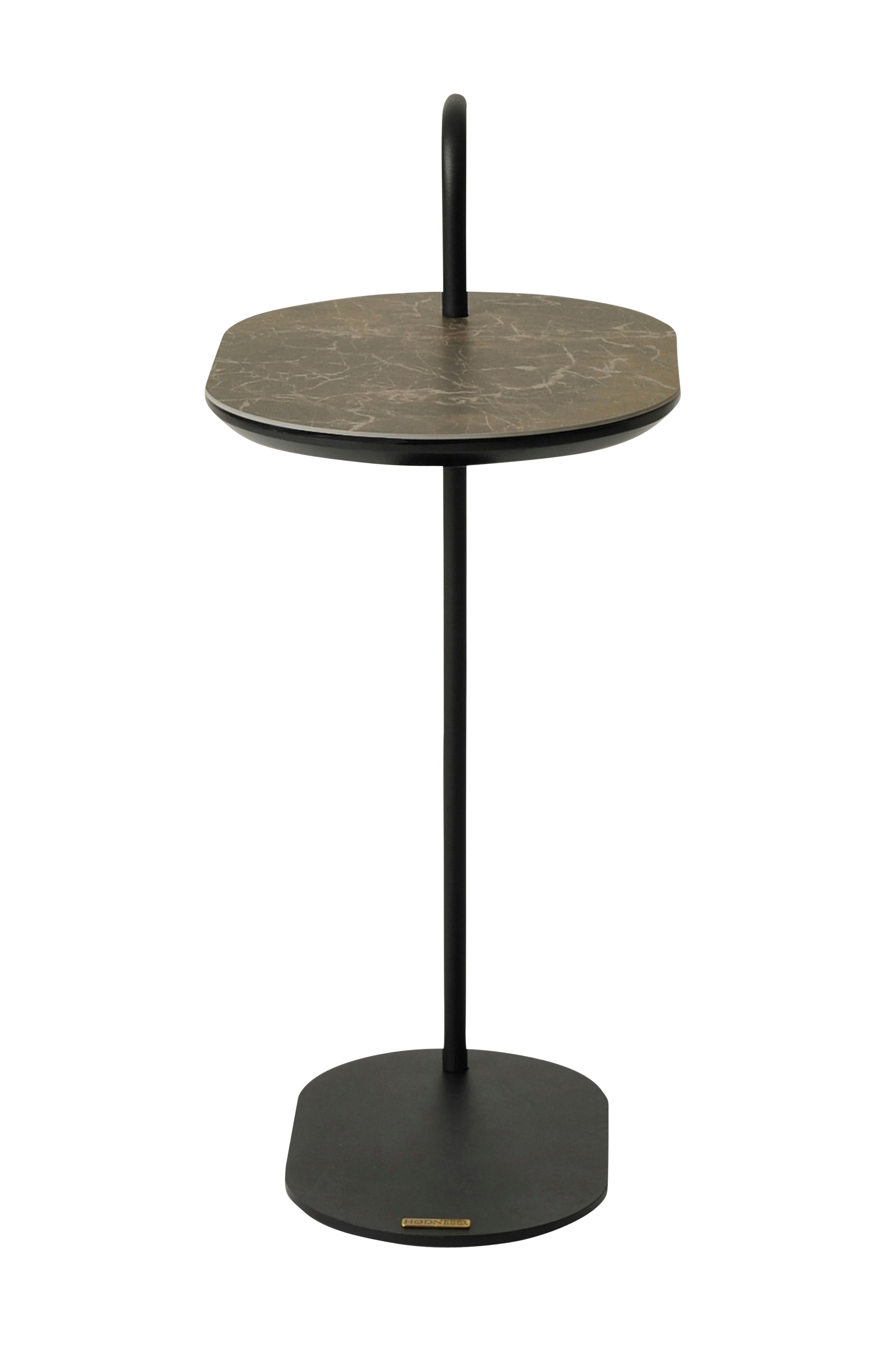 Praktiskt avlastningsbord. Topp i keramik som har en fin marmorlook. Underrede och handtag i lackerad metall. Bredd 28 cm, djup 40 cm och höjd 62 cm. Omonterad.