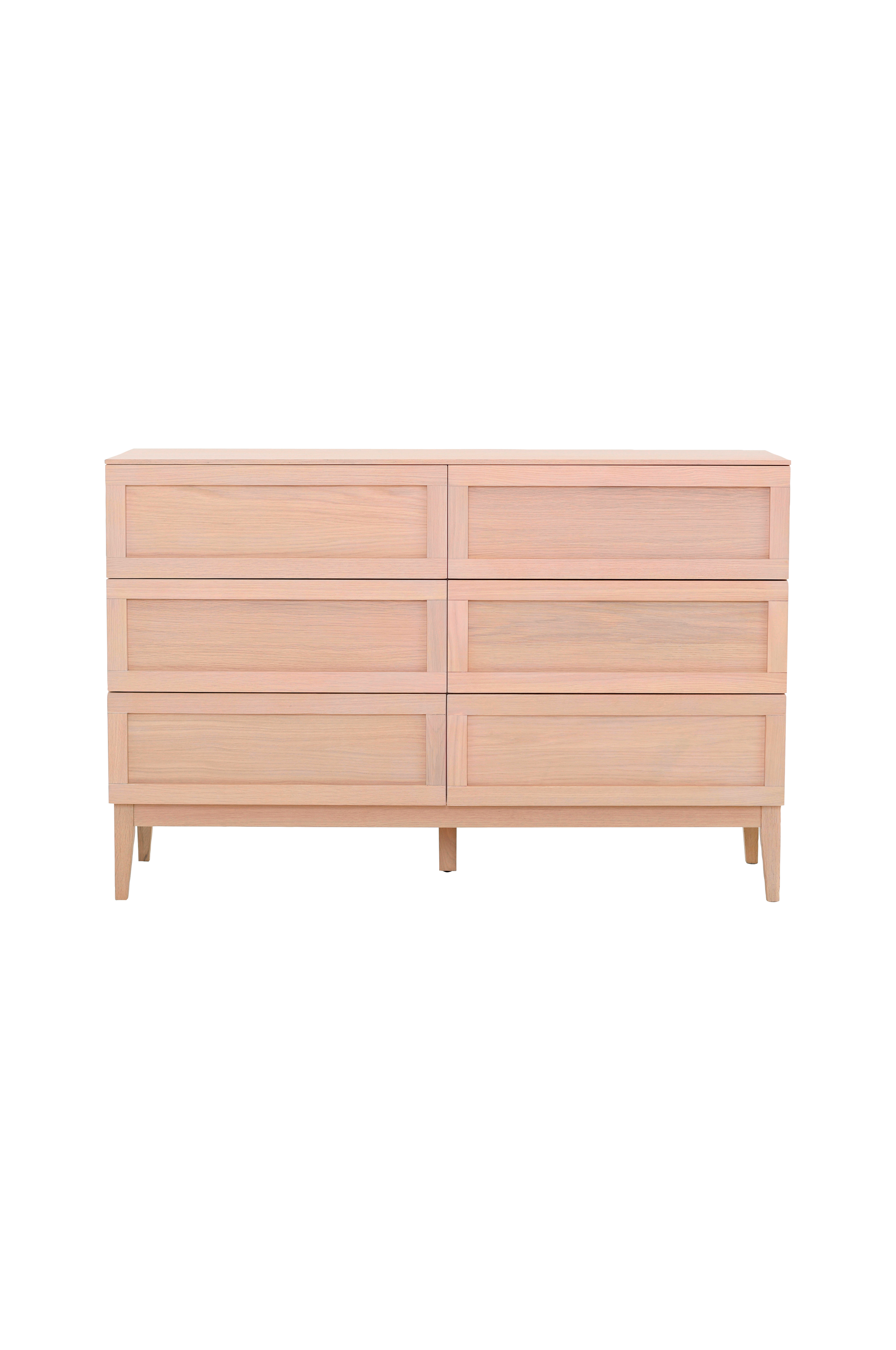 En elegant, modern byrå med en finish i lackerad ekfanér som framhäver träets naturliga ådring. Byrån har sex rymliga lådor utrustade med en mjukstängande mekanism som garanterar en smidig och tyst funktion.