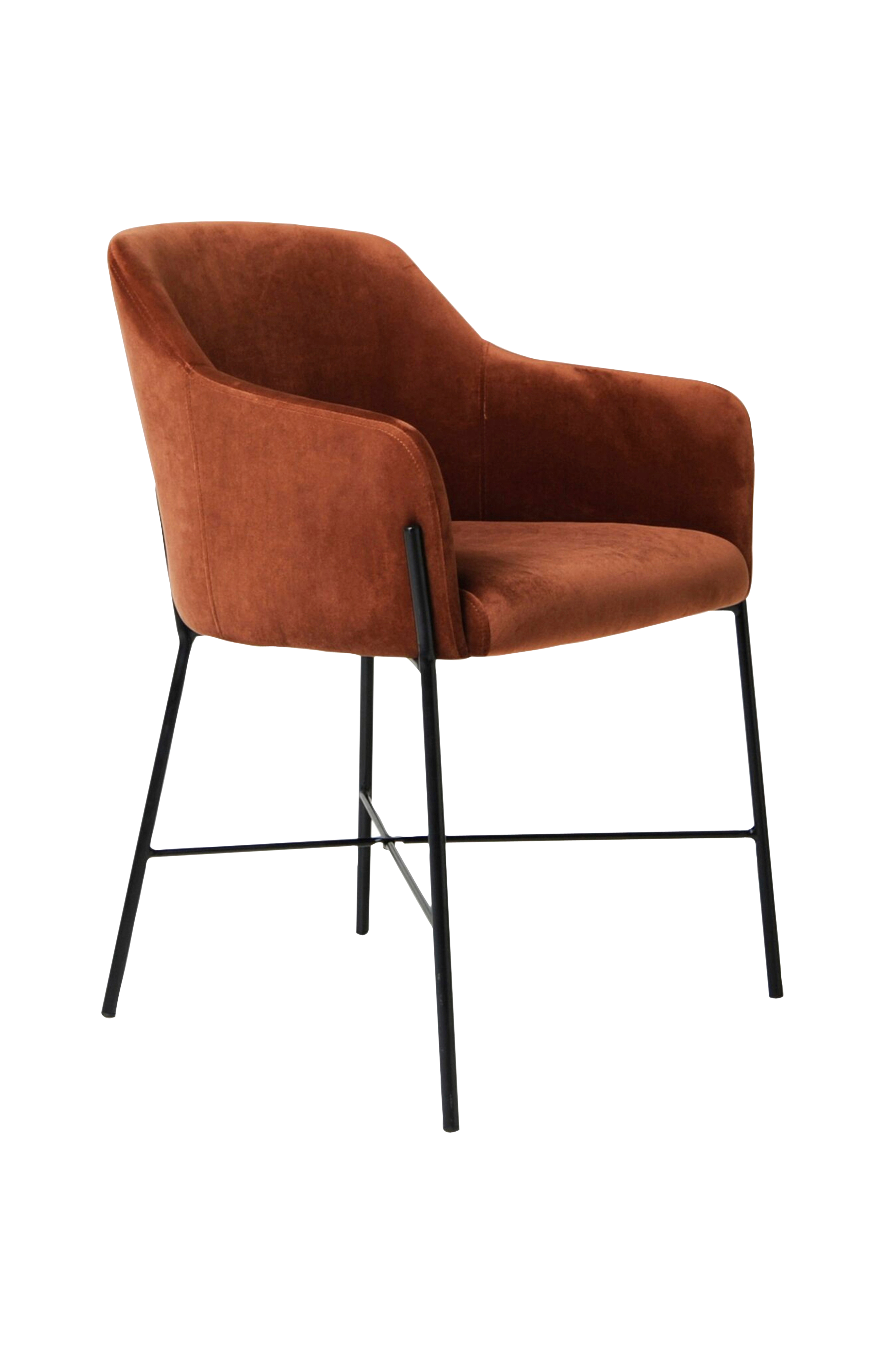 Bekväm matstol med armstöd i sammet och lackerat metallunderrede. Ligger 2 pack.