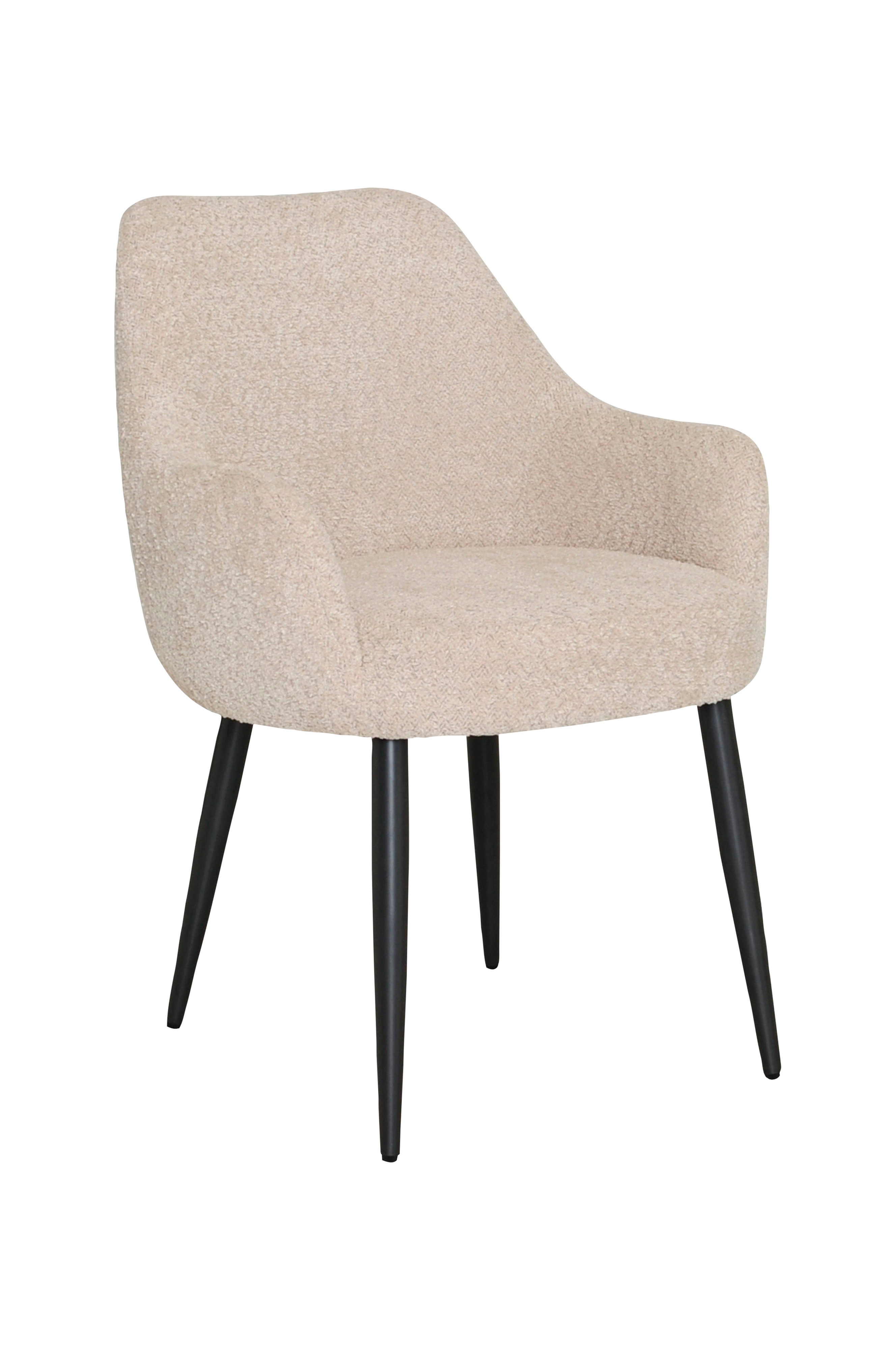 Modern och bekväm matstol i tyg och ben i lackad metall.