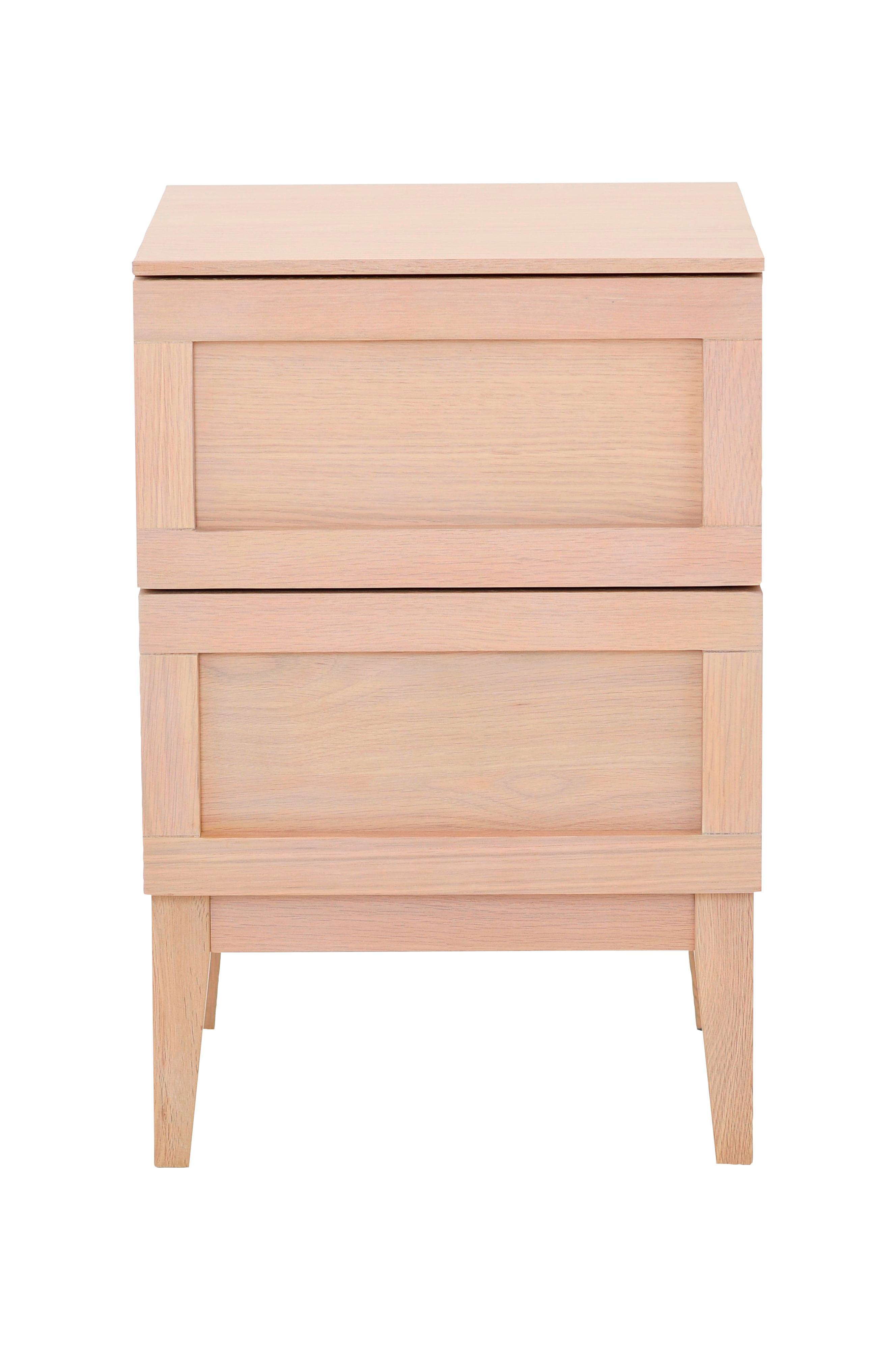 Ett snyggt, modernt sängbord med lackerad ekfaner som framhäver träets naturliga ådring. Möbeln har två lådor utrustade med mjukstängande mekanismer, vilket garanterar en smidig och tyst funktion.