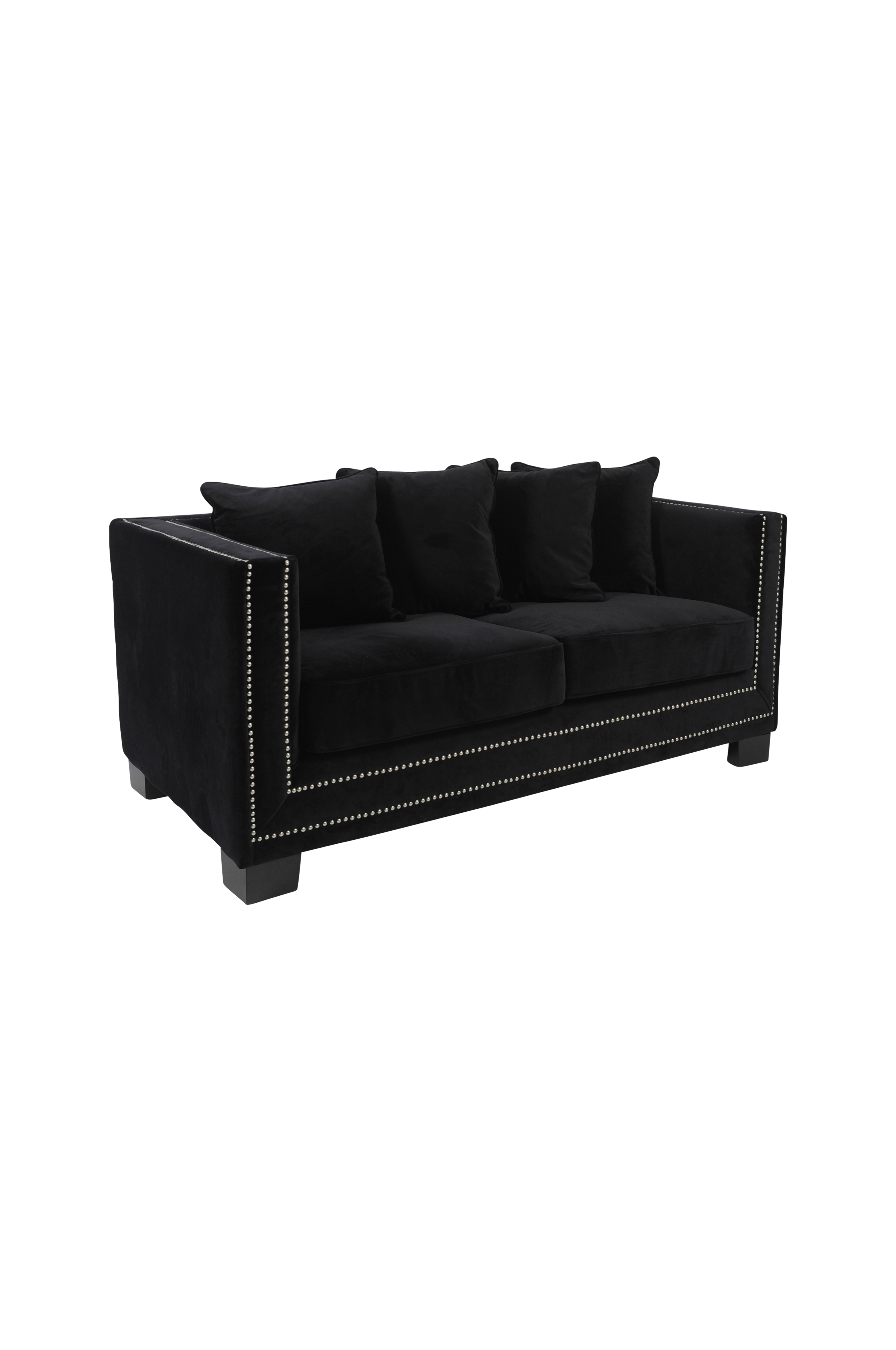 Soffa i svart velour med blanka dekorationsspik. Svartlackerade träben. 4 st kuddar ingår. Säljs i 1-pack. Monterad.