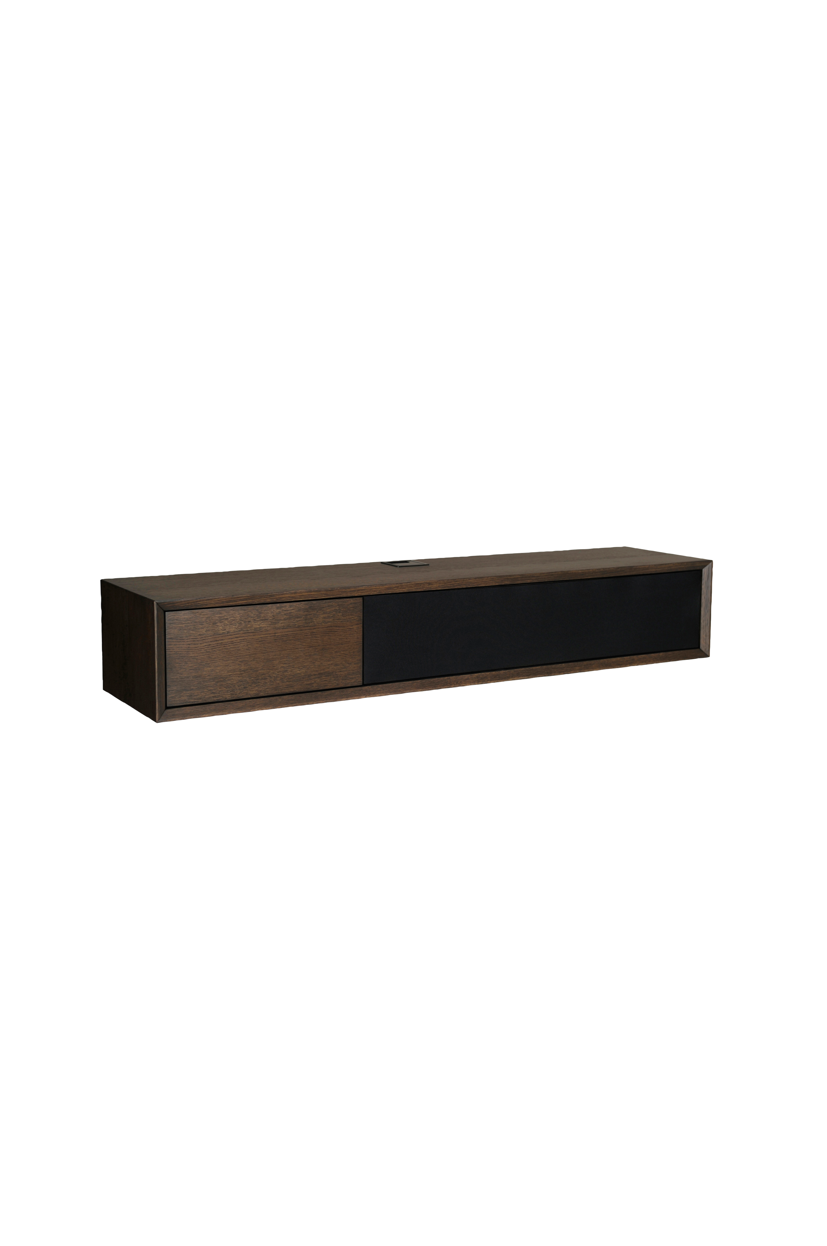 Hyllan är tillverkad av lackerad ek. Dörren/luckan är klädd med mesh-tyg, så att det går att gömma dosor snyggt samtidigt som fjärrkontrollen fungerar optimalt.