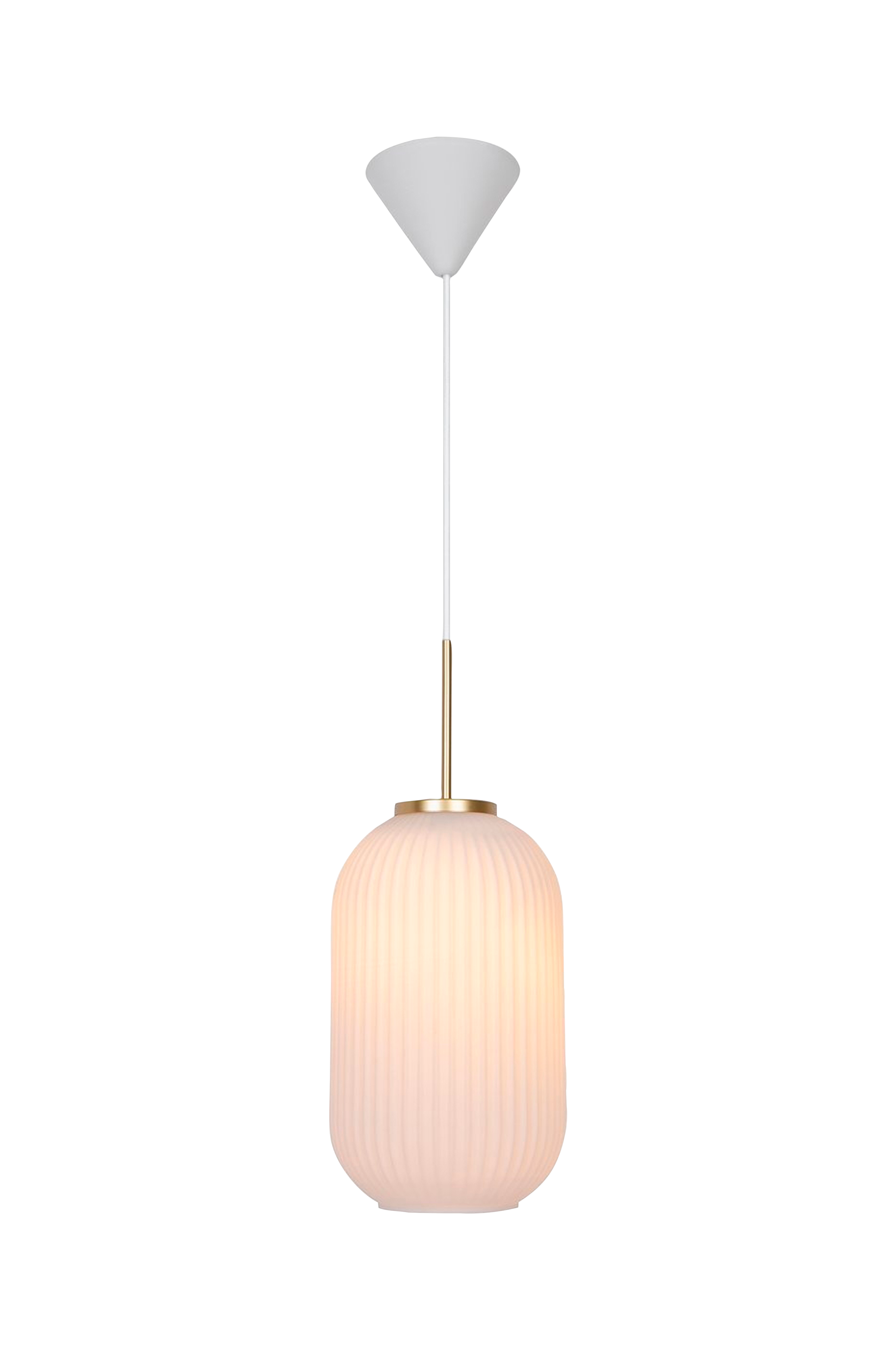 Milford är en dekorativ belysningsserie där det opalvita munblåsta glaset skapar en mjuk och nästan ”veckad” look. Designen är klassisk och vintage, balanserad med en modern twist i form av mässingsupphängningen. Kombinationen av de organiska formerna och den räfflade ytan skapar elegans och lyser upp rummet med ett mjukt och varmt ljus.