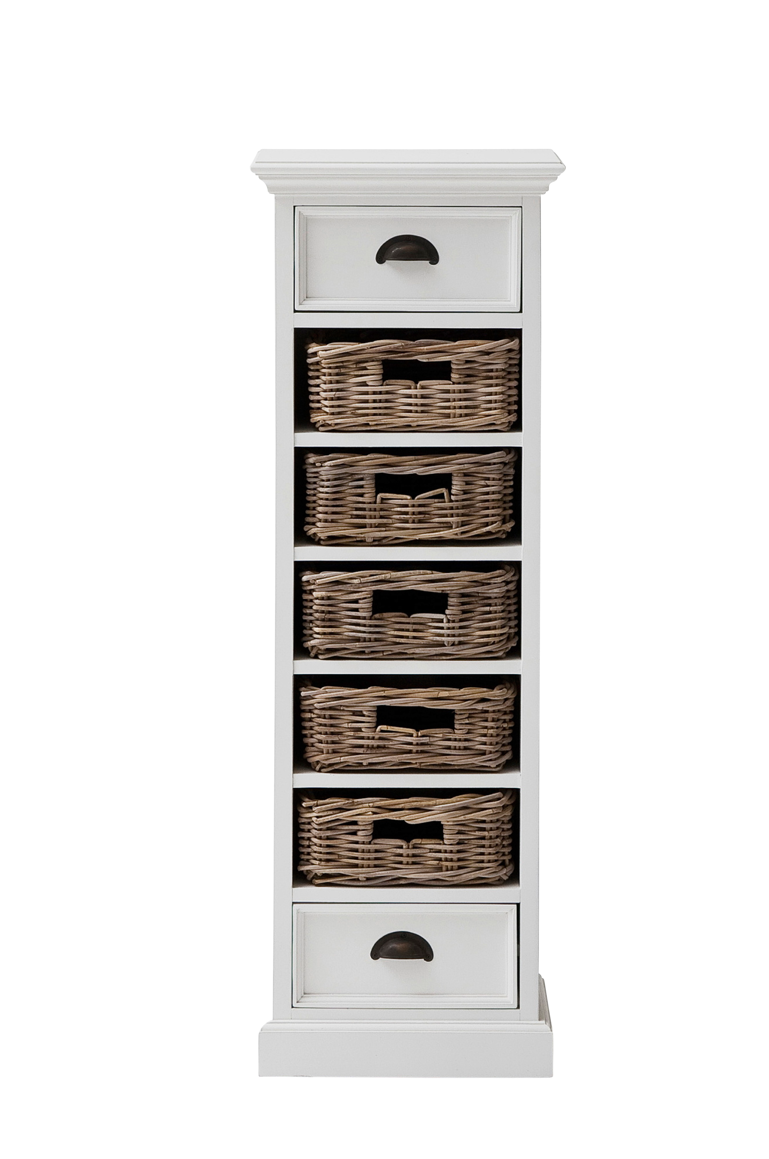 Smart designade förvaringsenheter med torn erbjuder snyggt och praktiskt i ett charmigt paket. Handvävda korgar i kubu-rotting, placerade på hyllor, utgör en attraktiv motvikt till lådorna och återspeglar den look som halifax -kollektionen är känd för. Utsvängda lister och beslag i antik mässing fulländar looken.