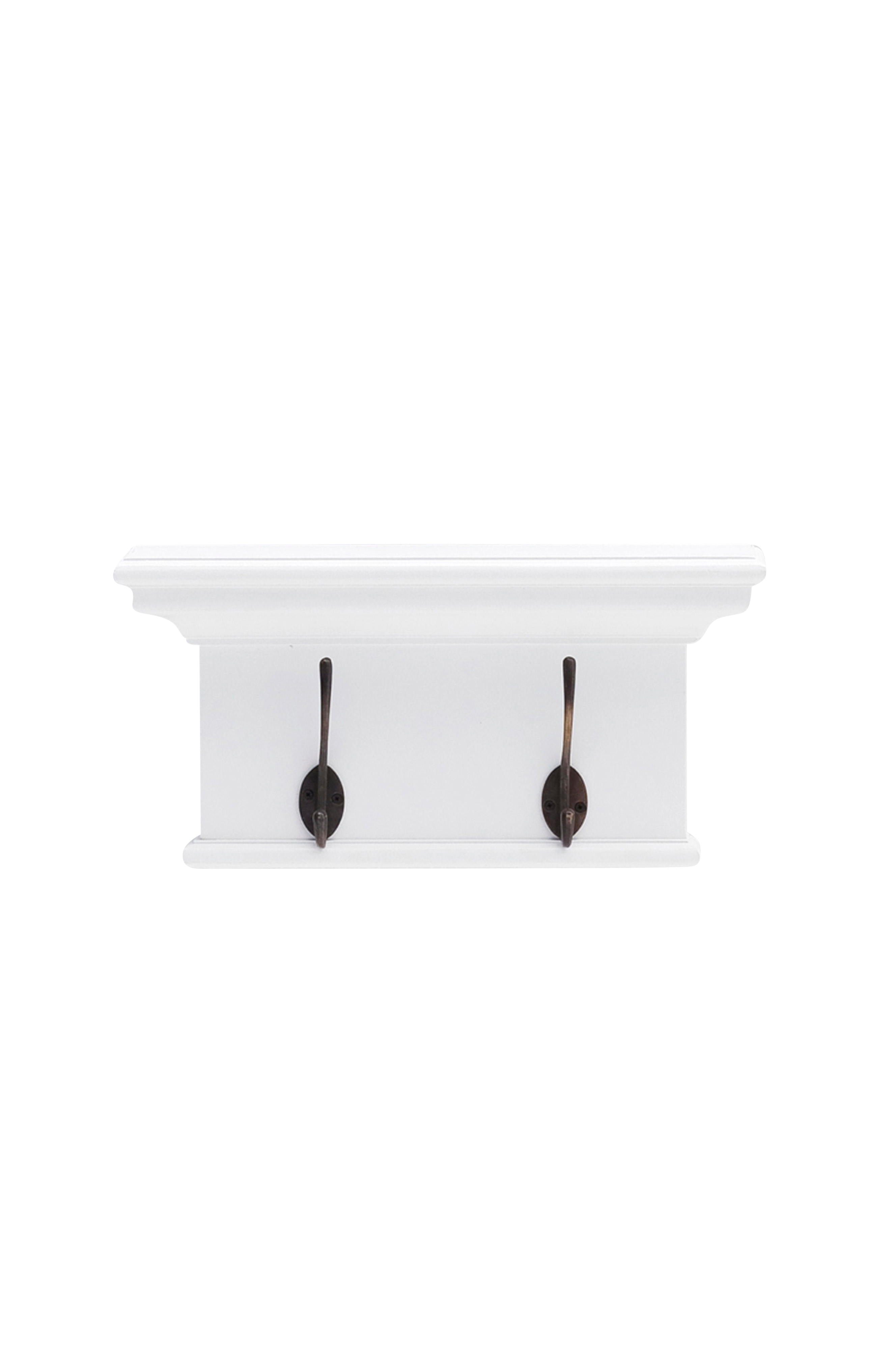 Lägg till lite känsla med denna smart designade klädhängare. En liten hylla har integrerats i kronlisten, som en plats att visa upp dina dekorativa föremål. Stora klädkrokar med antik mässingsfinish ger plats för jackor, nycklar eller handväskor. Välj mellan 2, 4, 6 eller 8 krokar.