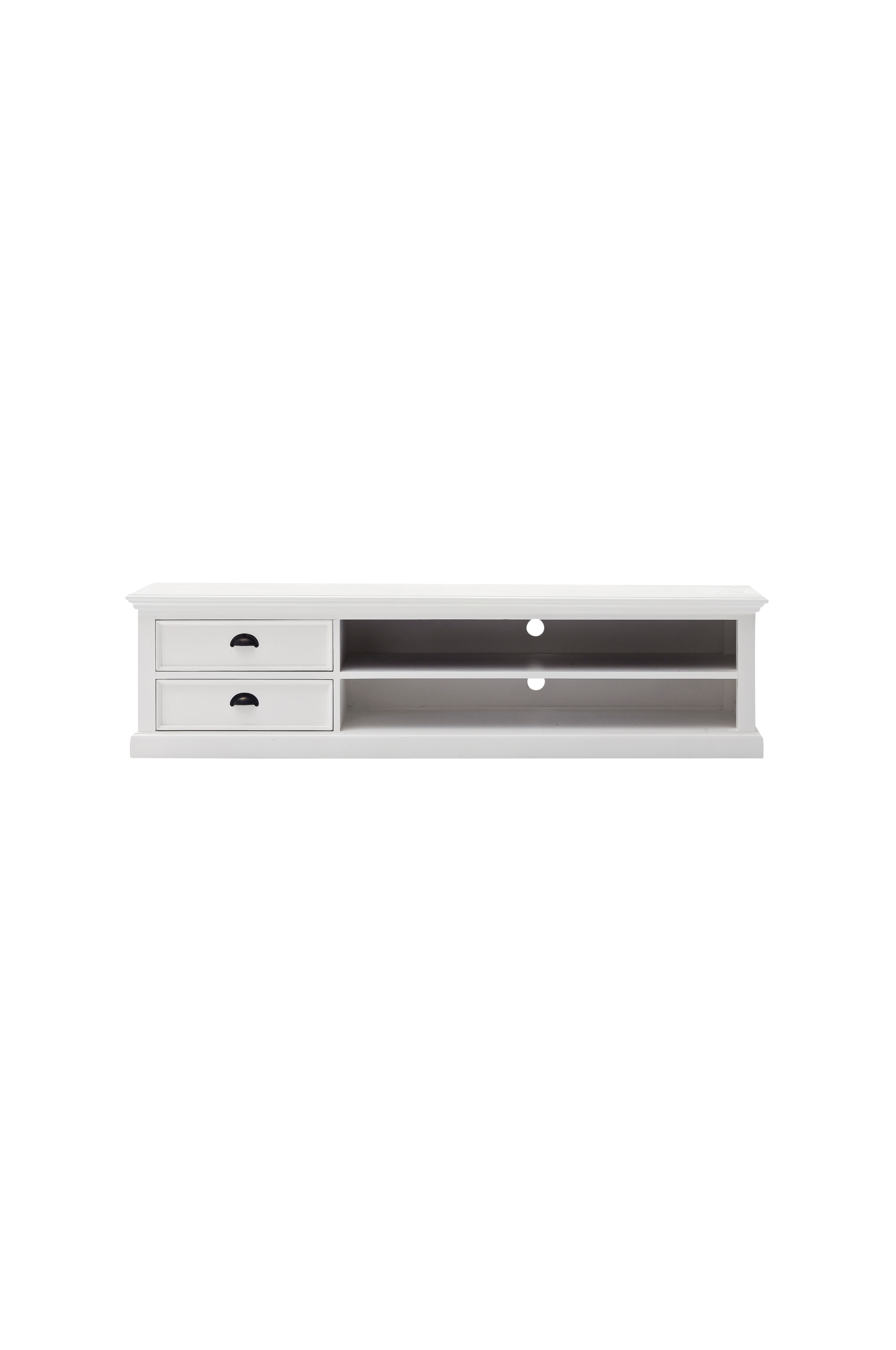 Den låga profilen på detta underhållningscenter erbjuder den perfekta plattformen för att visa upp alla dina mediakomponenter. Tv-tittandet sker på perfekt höjd och hyllorna ger gott om plats för ytterligare elektroniska enheter. Sladduttag finns på plats för att underlätta anslutningen. I lådorna finns plats för mindre tillbehör och bruksanvisningar. Konstruktionen i massivt trä med detaljerade lister framhävs av en halvblank målad yta. Utsvängd kronlist och detaljerade lister ger möbeln en enkel elegans. Hårdvara i antik mässing fulländar utseendet.