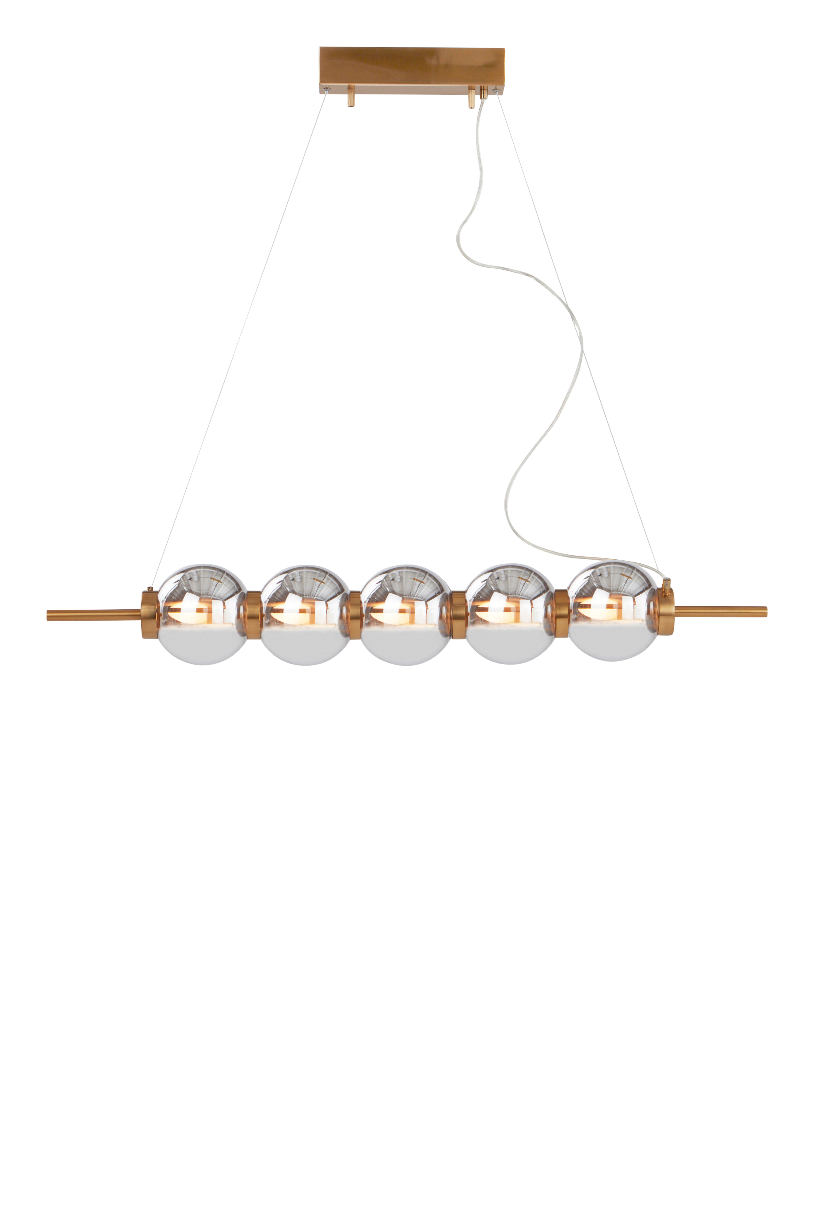 Taklampa av mässingsfärgad metall med fem runda, färgade glaskupor på rad. ON A ROLL är en innovativ och spännande taklampa som lyser upp över ditt matbord, och är lika snygg över soffbordet eller över en bänk. Lampan är jordad, klass 1. På grund av EU-regler behövs en separat takkontakt i vissa länder. Takkontakten ska vara jordad (klass 1) och köps separat.