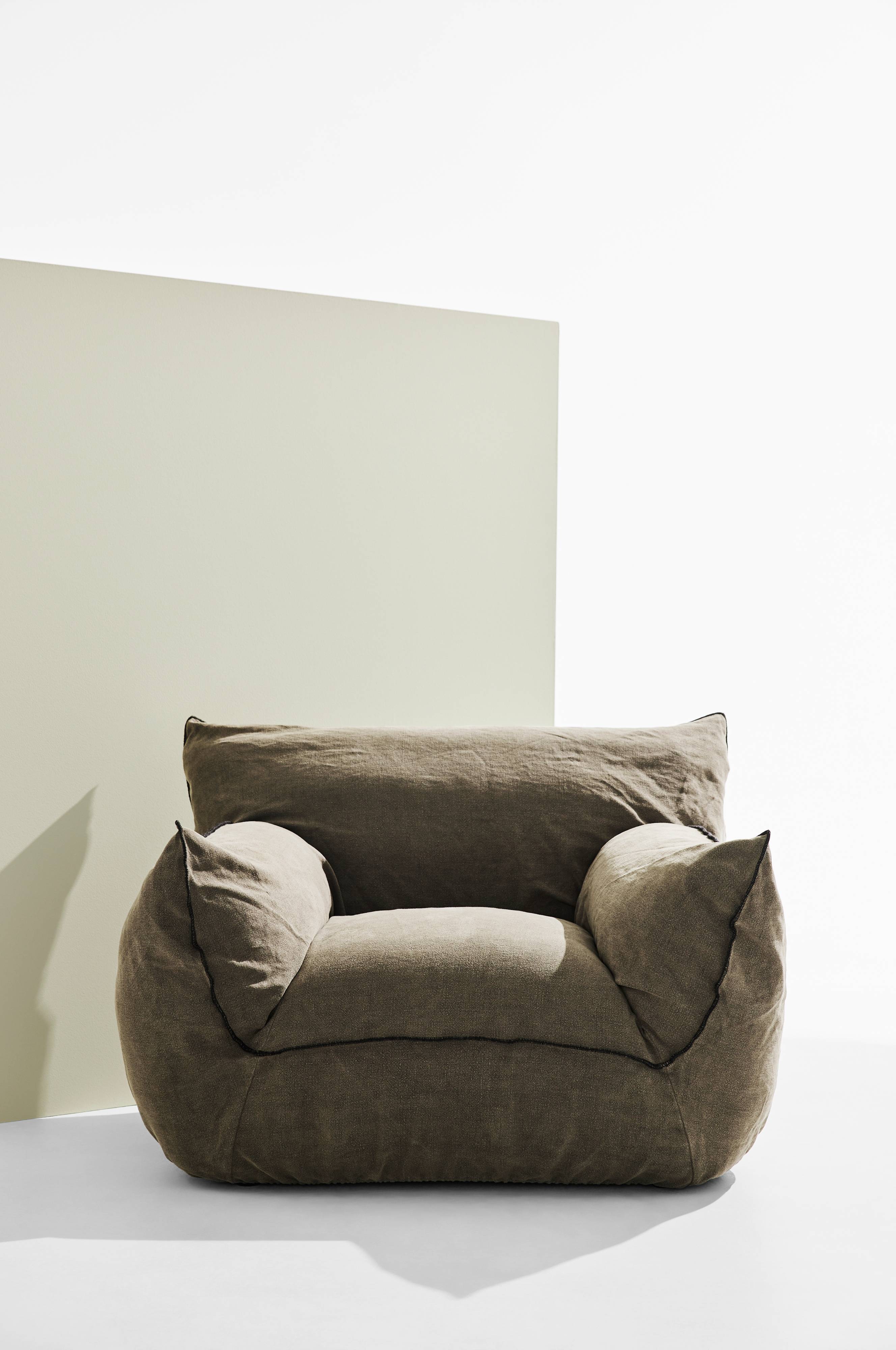 Stor och generös fåtölj som du sitter fantastiskt skönt i. Hela du får plats och du kan enkelt krypa ihop och dra upp benen, supermysigt. Den avtagbara klädseln är av 100% linne och har skön, lös passform och kan tvättas med våt trasa. Klädseln har en förstärkt på baksida för bättre hållbarhet. Overlocksöm ger speciell karaktär. Fåtöljen har en behaglig dunfyllning. Stommen är av FSC-certifierad furu och FSC-certifierad plywood som kombinerats med Zigzagfjädring och elastiska band för att göra fåtöljen bekväm. Stoppningen består av polyesterskum som kompletterats med dunfyllning, dunet kommer som grädde på moset.