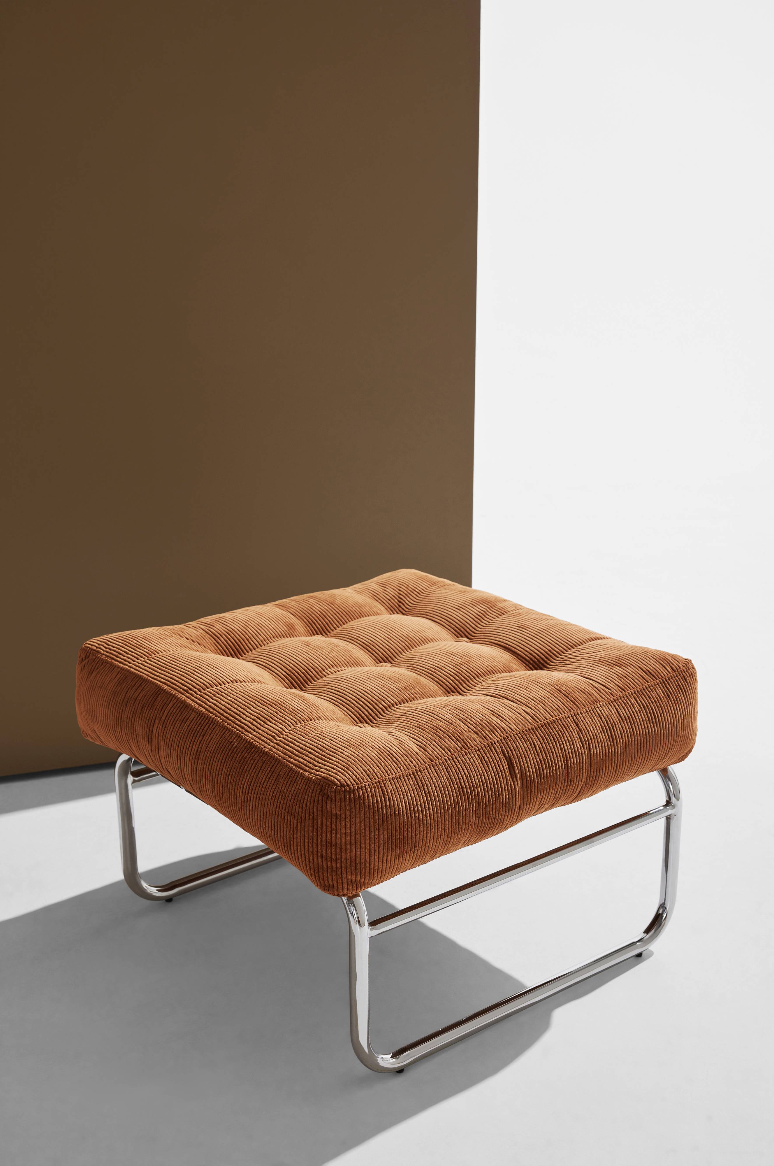Fotpallen Luca från Pastill för tankarna till 70-talet. Den förkromade järnramen och benen i kombination med manchesterklädseln ger dig en nostalgisk känsla - ett elegant val för ditt hem.