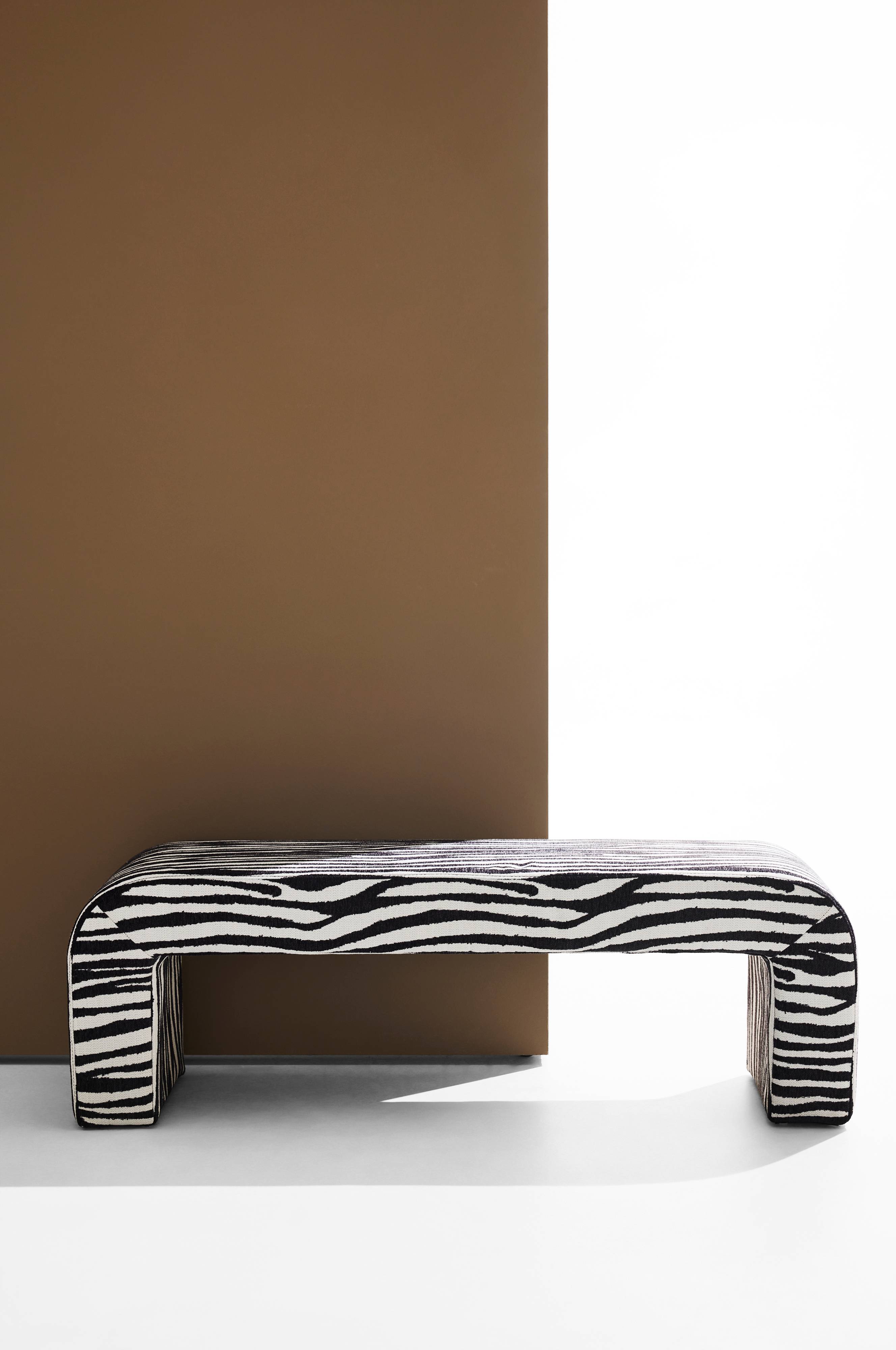 Bänk i en stilren modell med spännande form och klädd med zebratyg.