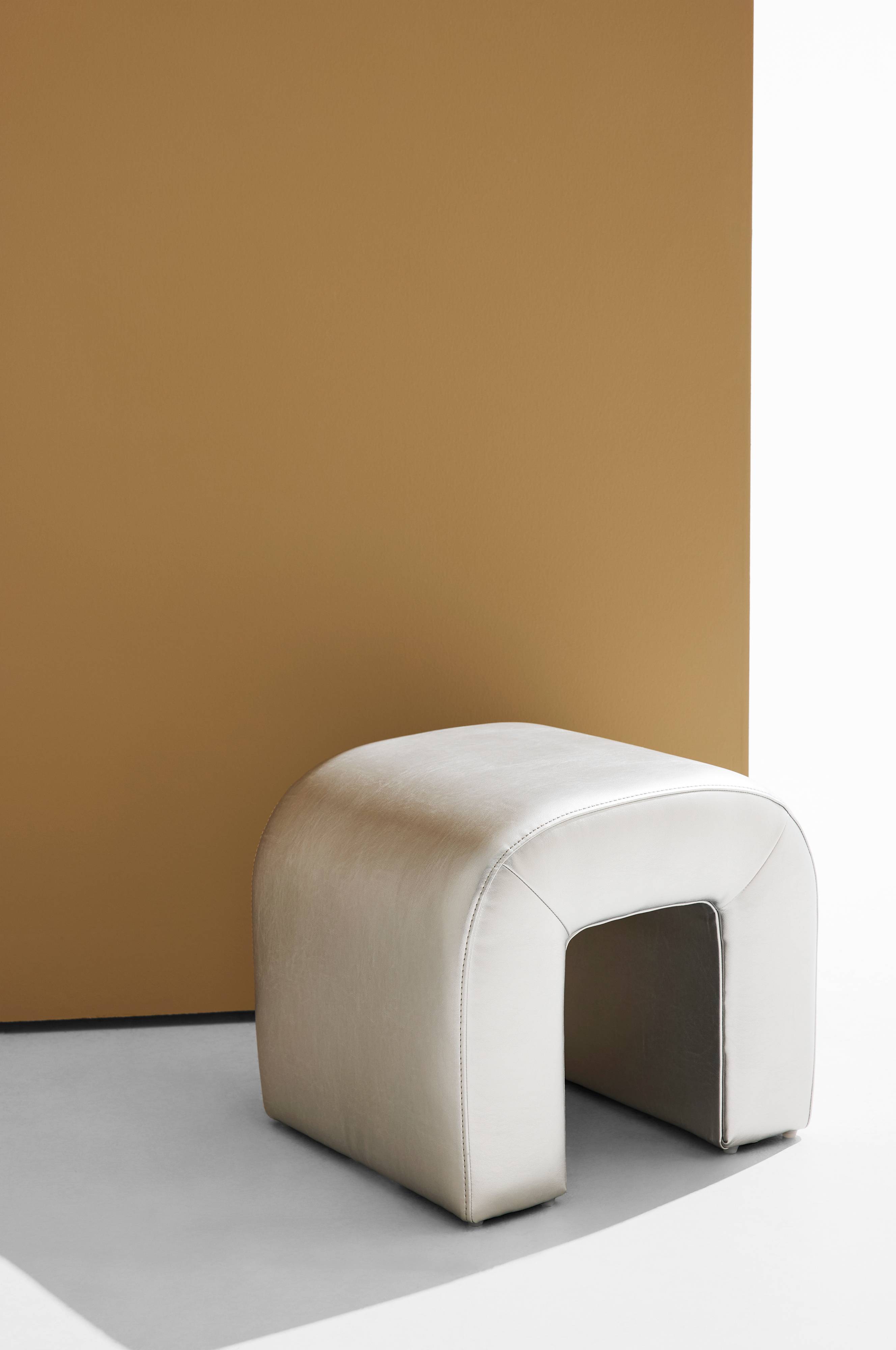 Pouf i läcker modell med spännande form och med silverfärgat PU-överdrag. Ger en känsla av space age och den tilltalande u-formen känns innovativ och ny.