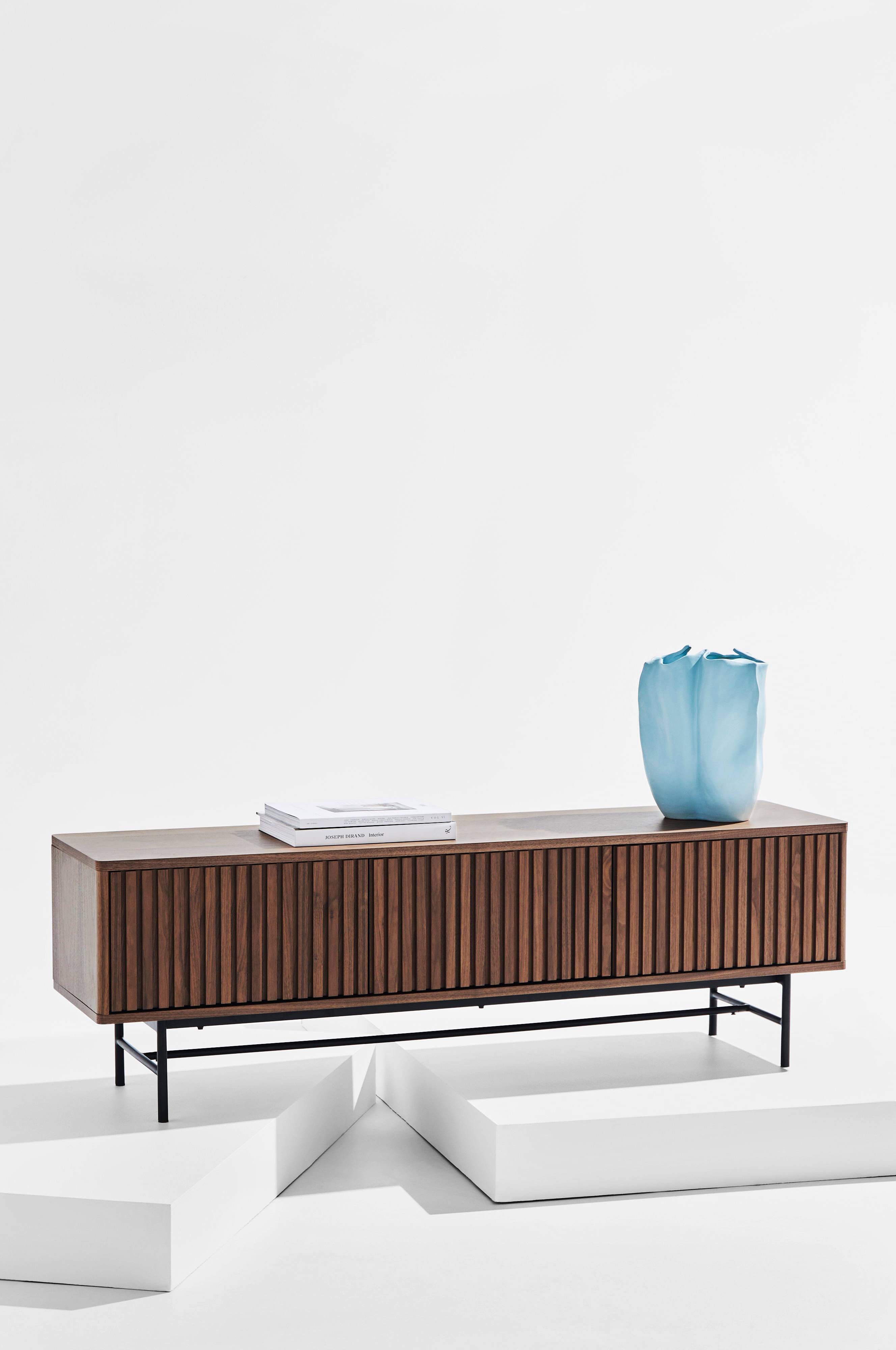 Gediget och välarbetat med tidlös design, så vill vi sammanfatta möbelkollektionen Rue. Tv-bänken har fin valötsfaner som ger klassisk attityd. De solida dörrarna har välformade, lodräta ribbor. Det ger dig helt dold förvaring samtidigt som ribborna ger en spännande yta som ändrar karaktär beroende på hur ljuset faller. Dörrarna är infällda under toppskivan och skåpet får med det en slank kontur. De har mjukstängande gångjärn och du öppnar dem smidigt med pushfunktion. Dörrar utan handtag förstärker den stilrena känslan. De främre hörnen är mjukt rundade.