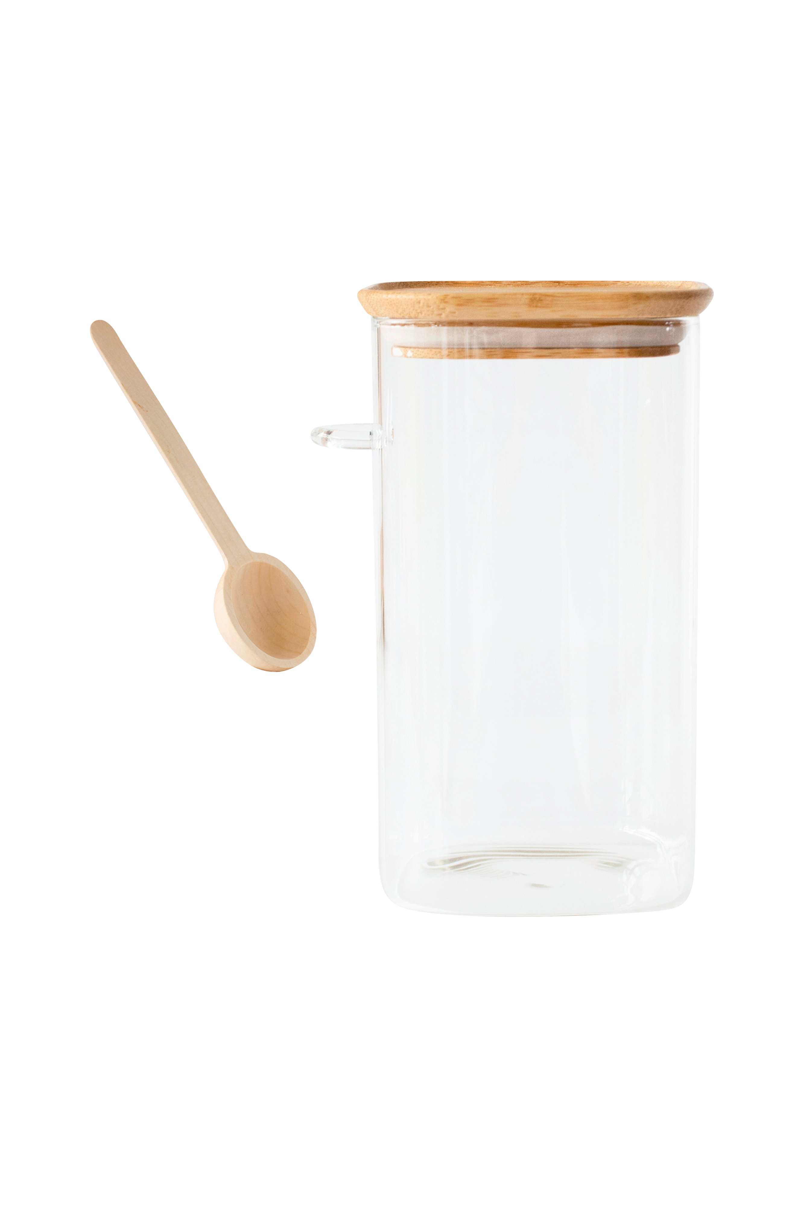 De är fyrkantiga för enkel förvaring och har en glasögla för att hänga upp en sked. Varje låda innehåller 5 ml skedar (motsvarande en tesked) för 800 ml-modellerna och 15 ml skedar (motsvarande en matsked) för 1,4 l-modellerna. Bambulocken är hermetiskt tillslutna med löstagbara silikontätningar. Burkarna tål maskindisk, med undantag för locken och skedarna av bambu. Bambubitarna kan inte diskas i diskmaskin!