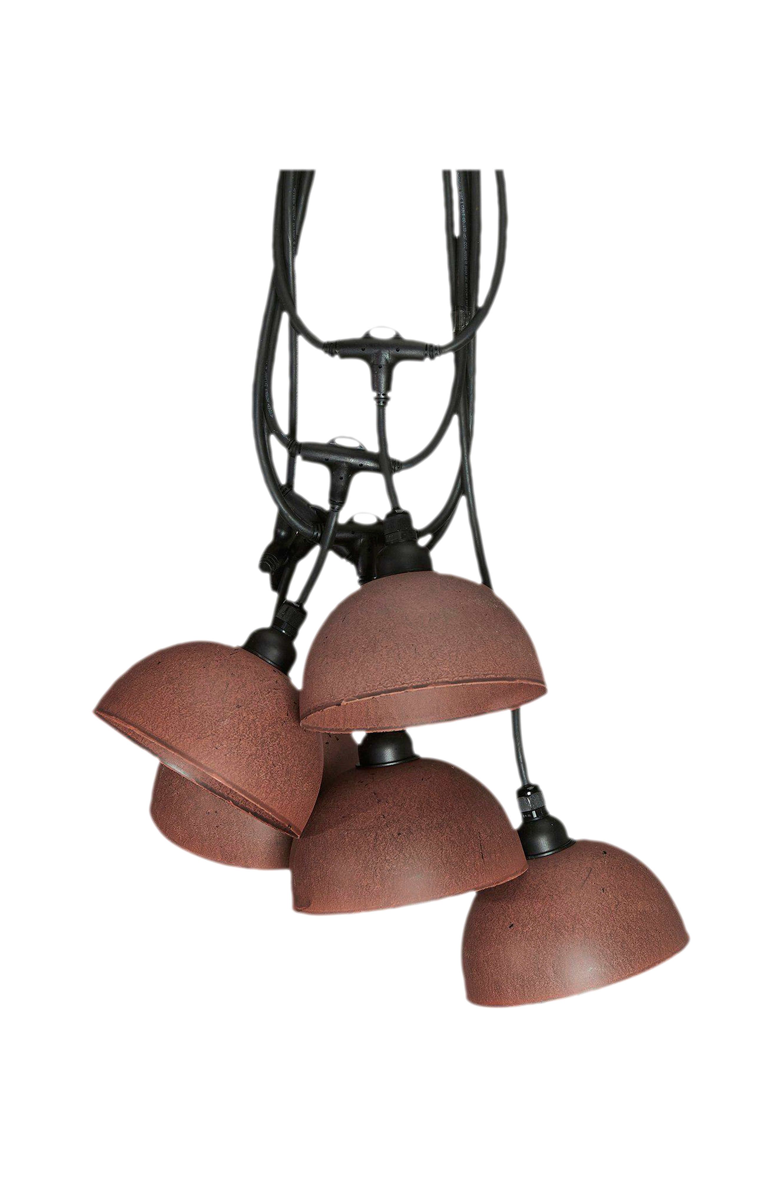 Flex Out ljusslinga för utomhusbruk (IP44) med 5 st. lamphållare. Total längd 6,5 meter, 2,5 meter till första lamphållaren, sedan 80 cm mellan varje lamphållare. 15 cm från T-koppling ner till skärmring. Här matchat med 5 st. Briggs lampskärm i metall med en rostfinish. Skärmen är 17 cm bred och 9 cm hög.