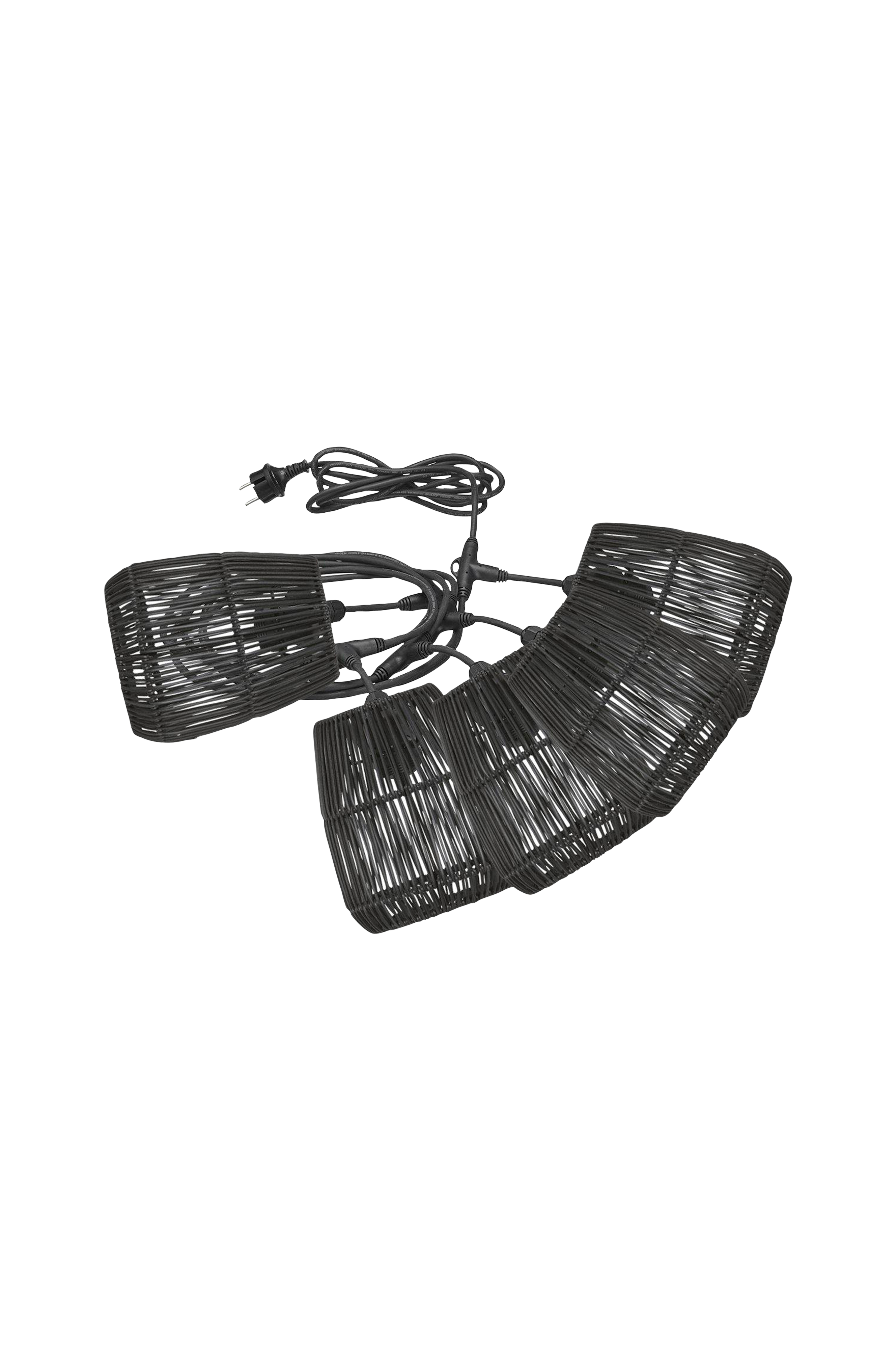 Flex Out ljusslinga för utomhusbruk (IP44) med 5 st lamphållare (5x15W). Totallängd 6,5 meter, 2,5 meter till första lamphållaren, sedan 80 cm mellan varje lamphållare. 15 cm från T-koppling ner till skärmring. Här matchat med 5 st Saigon lampskärm i konstrotting. Ljuskällor för utomhusbruk ingår ej. Skärmen är 18 cm bred och 20 cm hög.