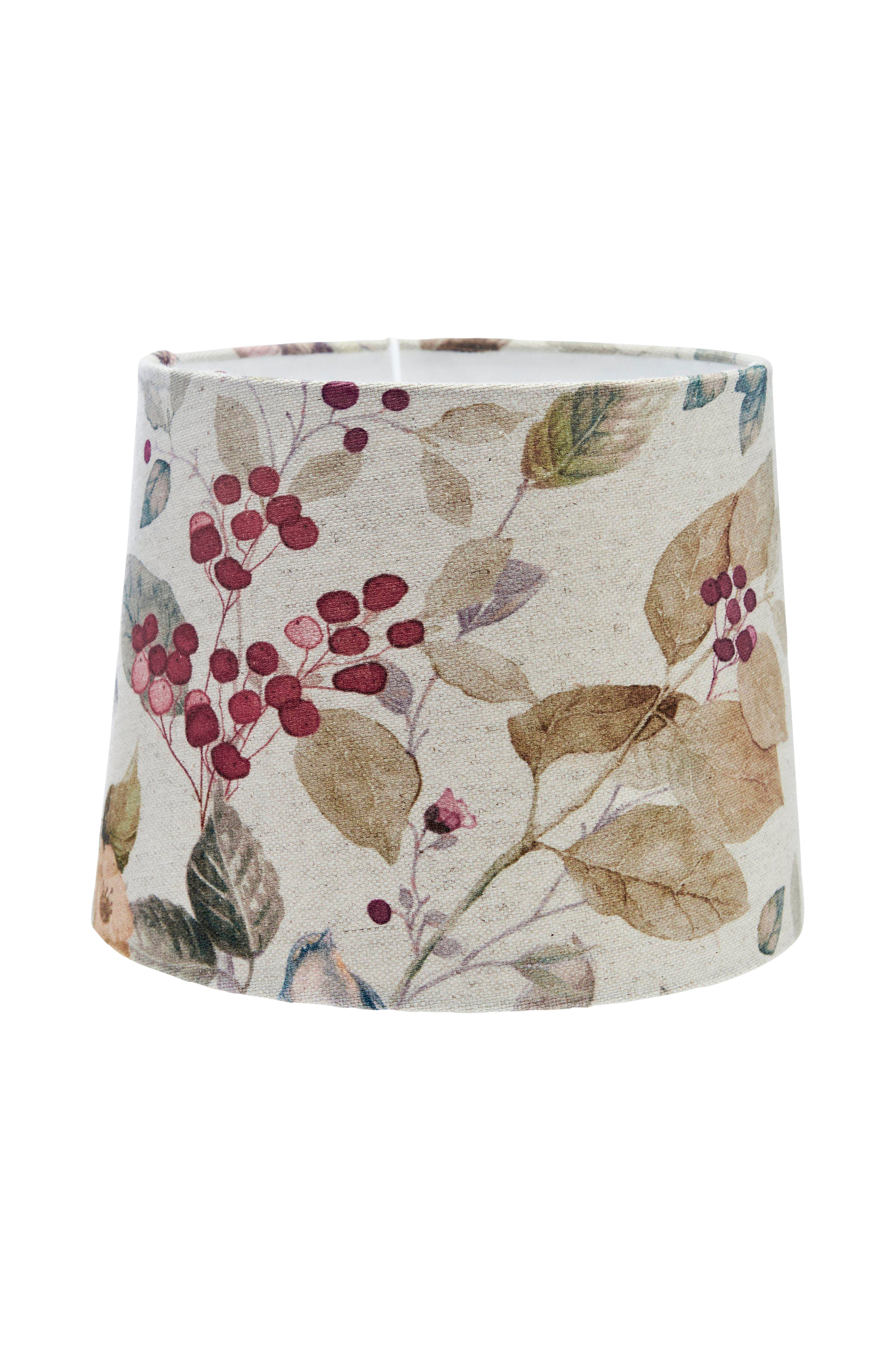Sofia lampskärm i ett mönstrat tyg. Skärmen har ett tryckt mönster med bladverk som påminner om en sommaräng i milda toner. Rullade kanter och en ljus insida som gör att ljuset flödar fint. Formen är lätt utställd och har E27 ringfäste. Bredd 25/22 cm.