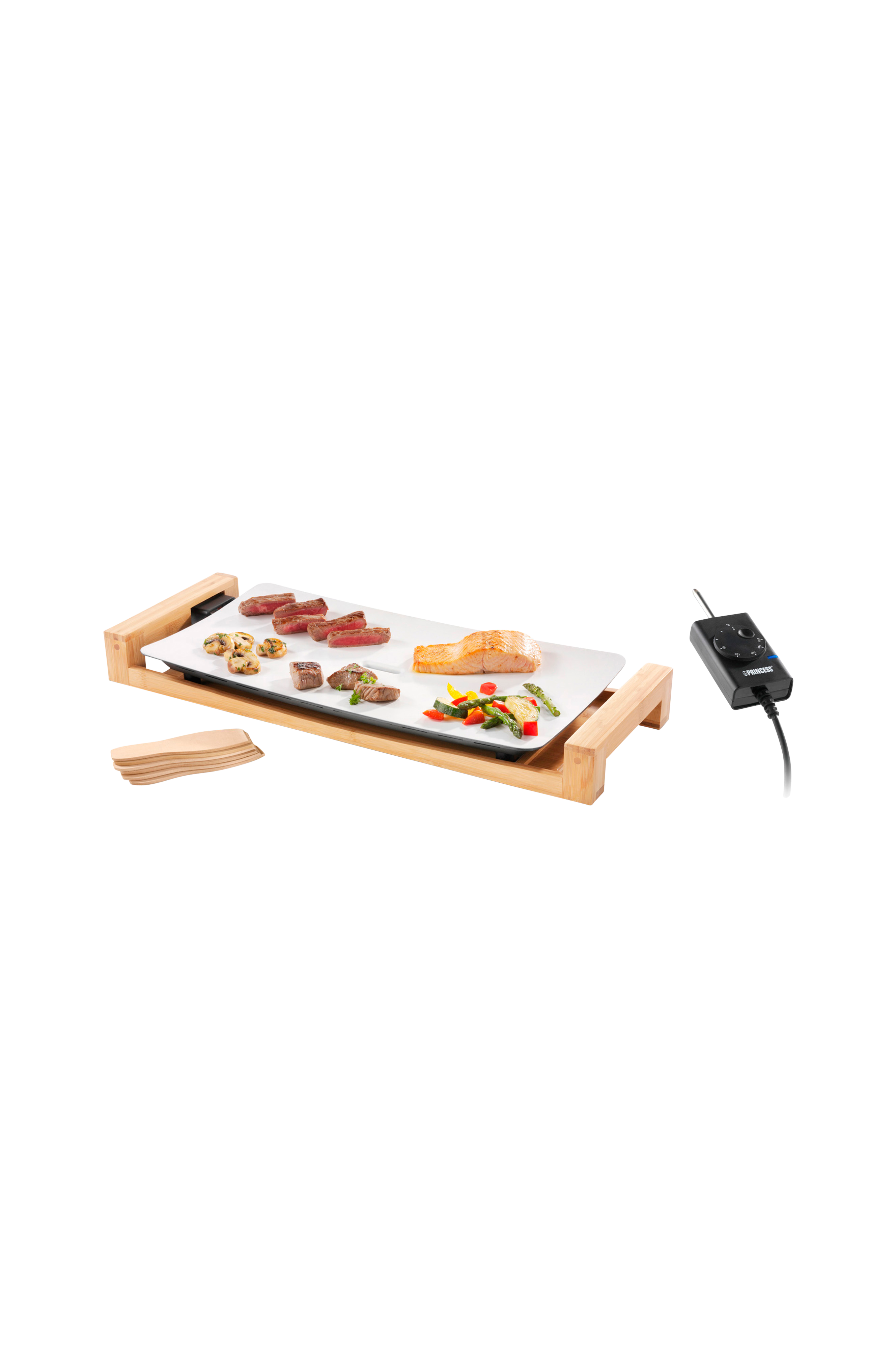 En ursnygg Table Grill Pure från Princess. Med sin trendiga design är denna ett perfekt val för dig som vill ha en både utseendemässigt och funktionmässigt bra grill. Måttet på grillen är 50 x 25 cm, den har en vit keramisk beläggning och designen innefattar snyggt behandlat bambu. Ett mycket trevligt sätt att avnjuta en god middag med dina vänner!