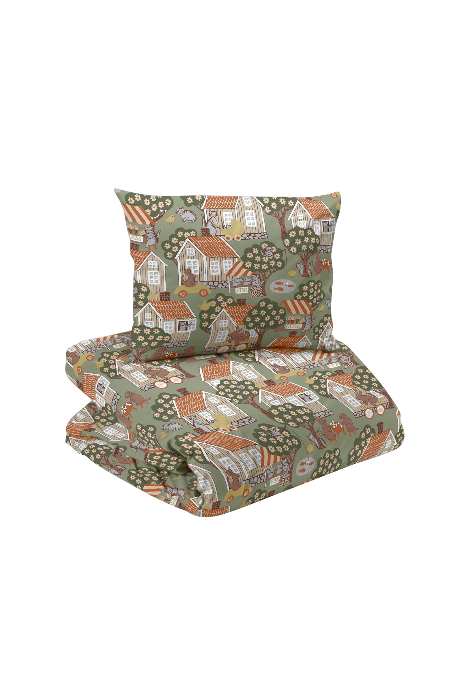 Ett charmigt bäddset för spjälsäng med ett mönster skapat av en svensk designer. Trådantal 104.