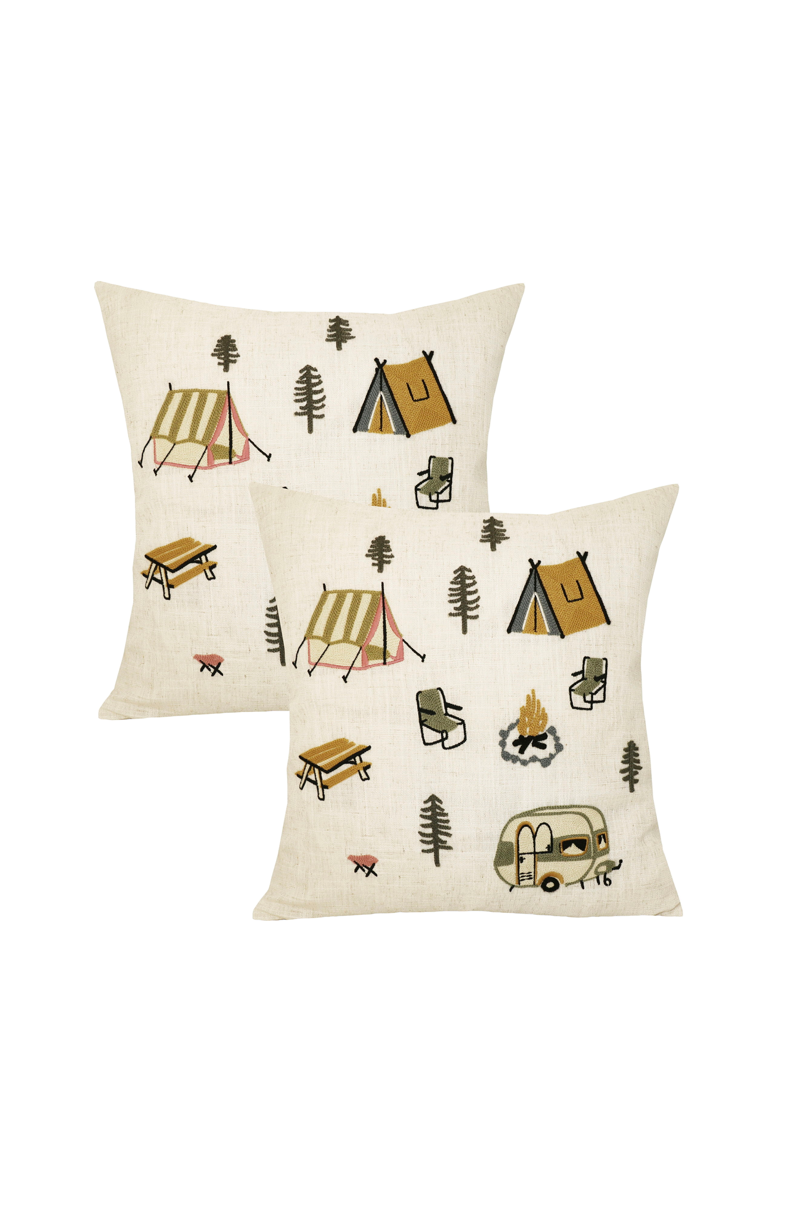 Broderat kuddfodral med motiv av ett tält, tallar, en husvagn och en lägereld - så klart! Perfekt att matcha med kuddfodralet som heter happy camper. Enfärgad baksida och dold dragkedja i nederkant, 2-pack.