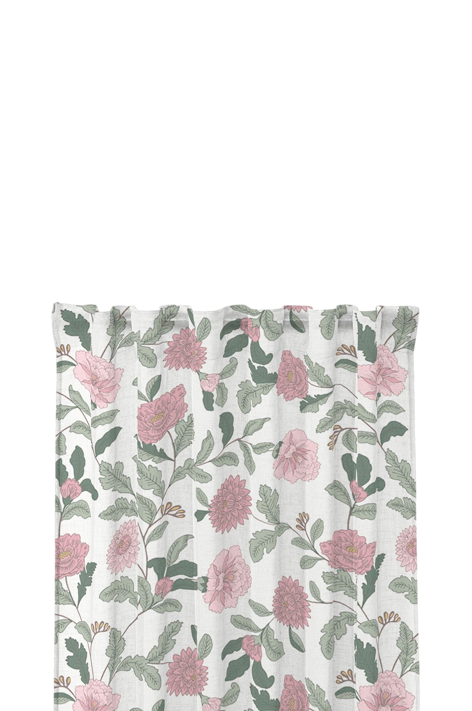 Färdigsydda gardiner i 2-pack med blommor och blad. Tryckt på tvåvägs slub-tyg för en vacker slub-struktur. Mönster skapat av en svensk designer