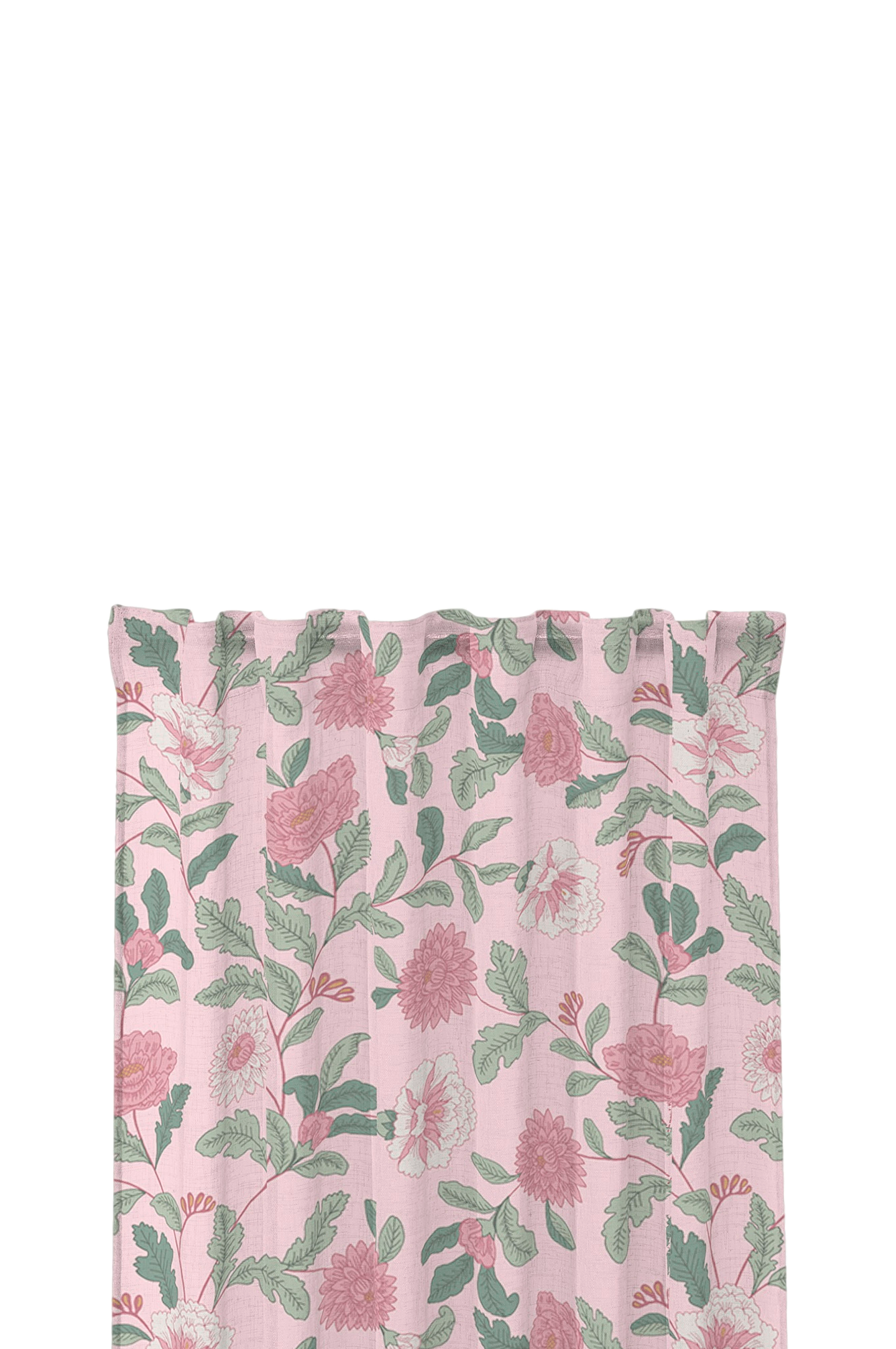 Färdigsydda gardiner i 2-pack med blommor och blad. Tryckt på tvåvägs slub-tyg för en vacker slub-struktur. Mönster skapat av en svensk designer