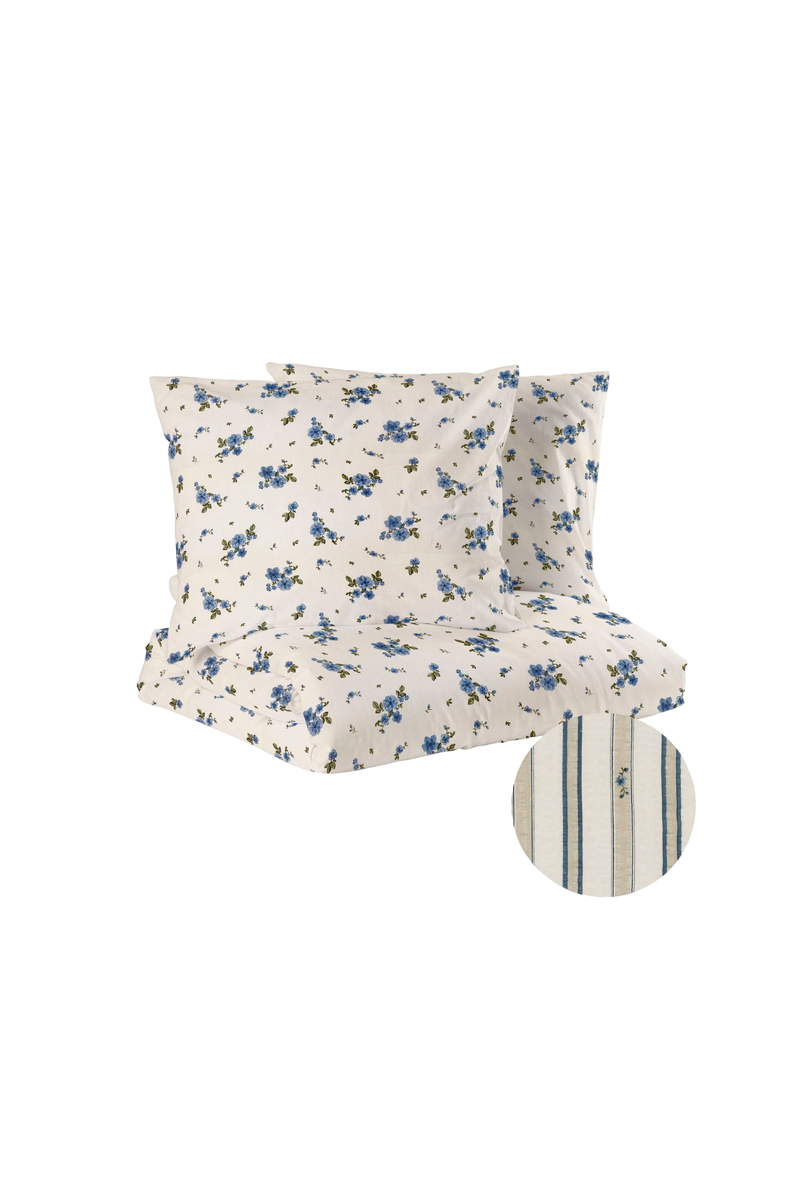 Bäddset i King size med två olika mönster, så att du inte behöver välja! Den ena sidan har en blommig design på en vit botten, medan den andra sidan är randig med små blommiga detaljer som matchar. Bäckebölja känns svalare än andra typer av sängkläder och erbjuder en bekväm känsla och ett elegant utseende tack vare den strukturerade ytan. Förpackad i en påse av samma kvalitet som bäddsetet. Trådantal 144.