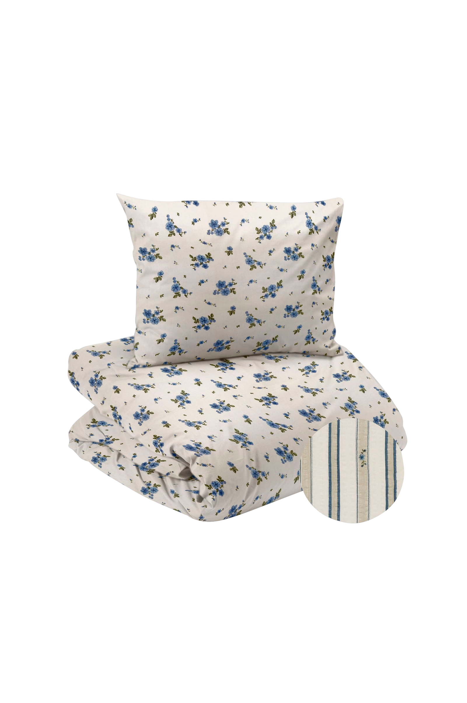 Bäddset med två olika mönster, så att du inte behöver välja! Den ena sidan har en blommig design på en vit botten, medan den andra sidan är randig med små blommiga detaljer som matchar. Bäckebölja känns svalare än andra typer av sängkläder och ger en bekväm känsla och ett snyggt utseende tack vare den strukturerade ytan. Förpackad i en påse av samma kvalitet som bäddsetet. Trådantal 144.