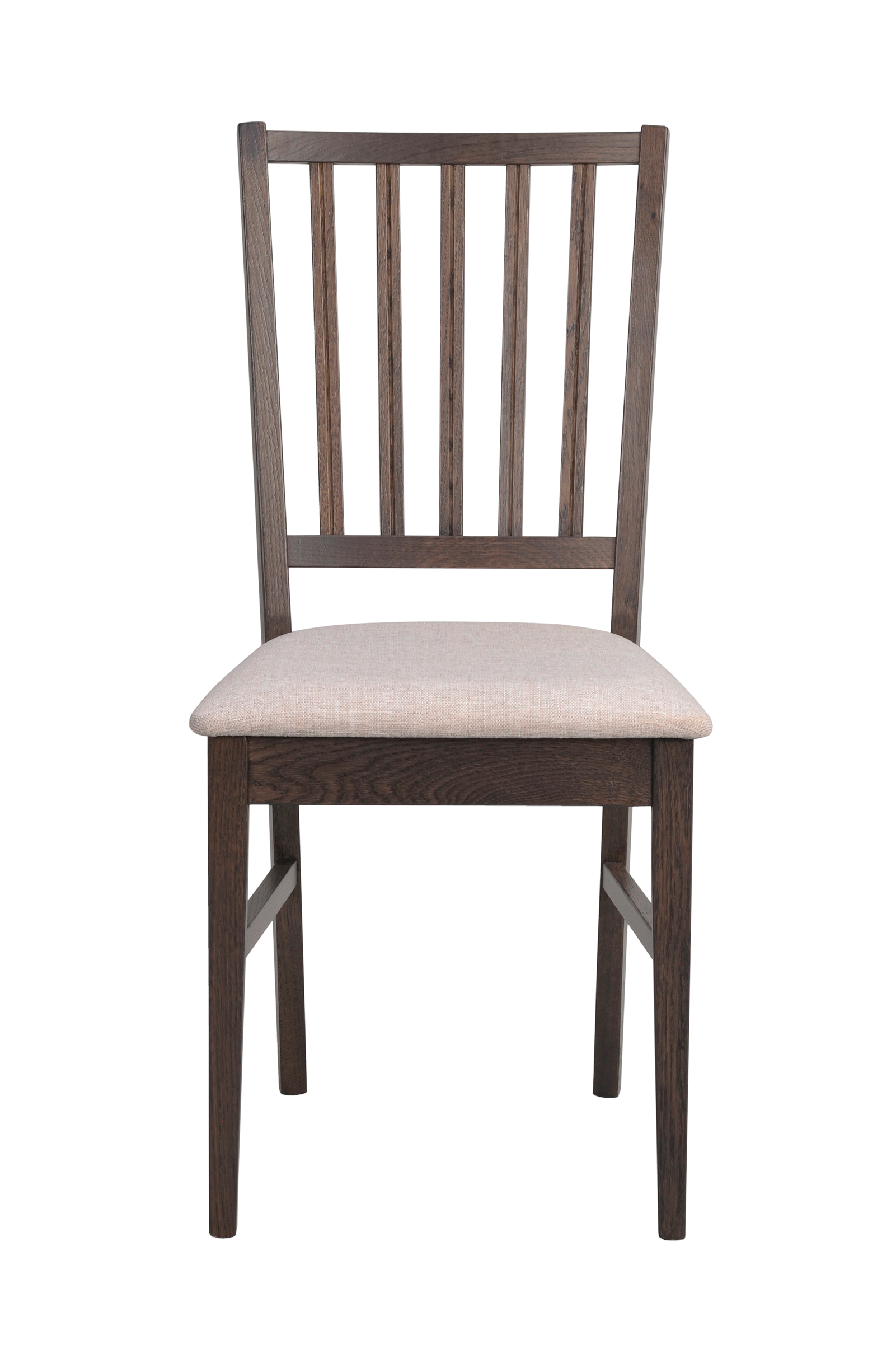 den stoppade sitsen i beige tyg skapar en elegant kontrast till ekens definierade linjer och ger en bekväm sittupplevelse, väl lämpad för långa middagar och sociala stunder runt bordet. De mjuka tonerna i klädseln bidrar till ett lugnt och inbjudande helhetsintryck som förhöjer både stolens design och rummets atmosfär.