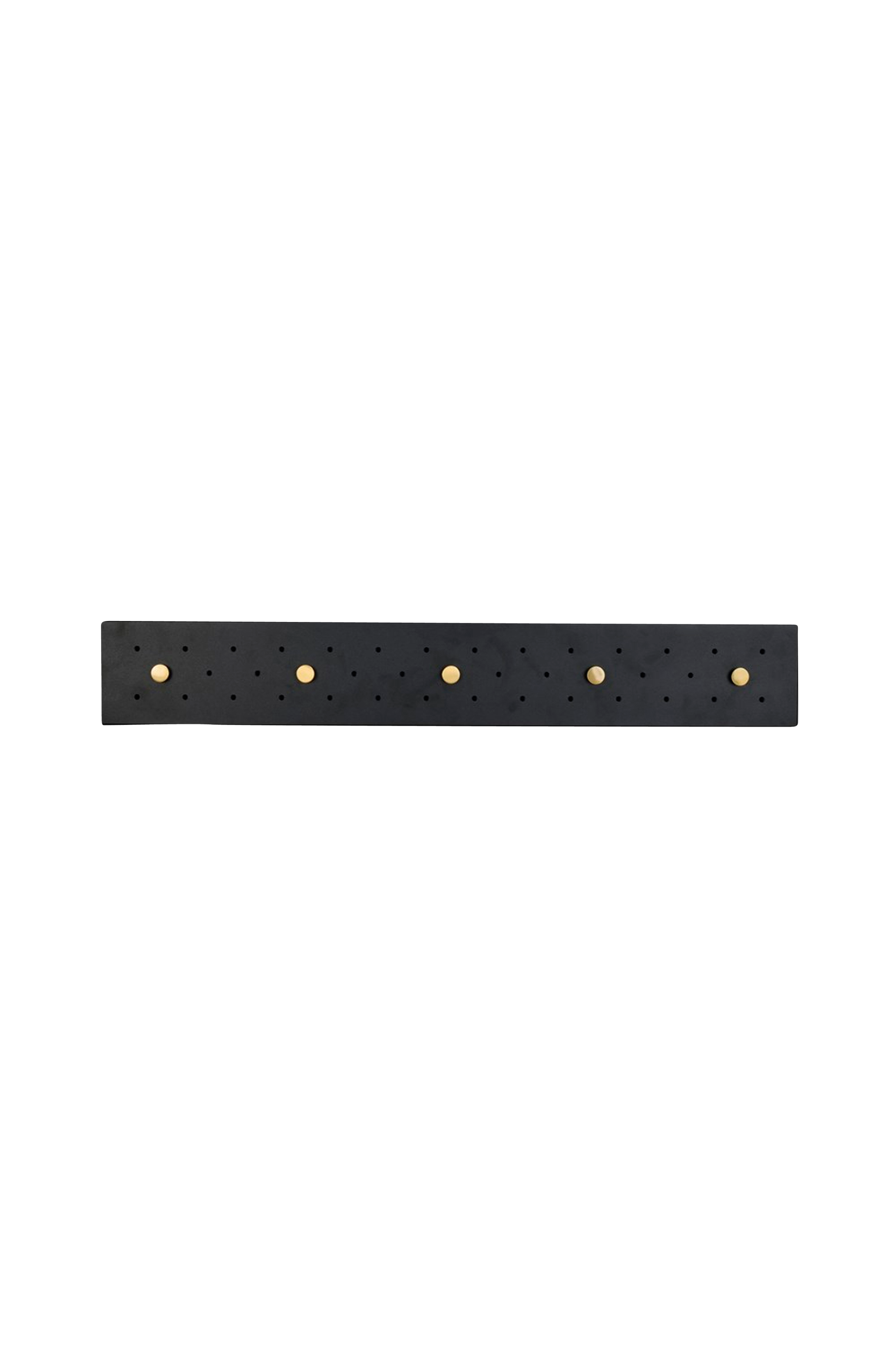 Malone kroklist i 80 cm i svart pulverlackad metall med 5 knoppar. Kroklisten är flexibel och du väljer själv var du placerar knopparna i guldfärg. Bredd 80 cm, höjd 12 cm, djup 2 cm. Malone är vår senaste hallserie och består av flera olika delar som passar perfekt i en modern hall.