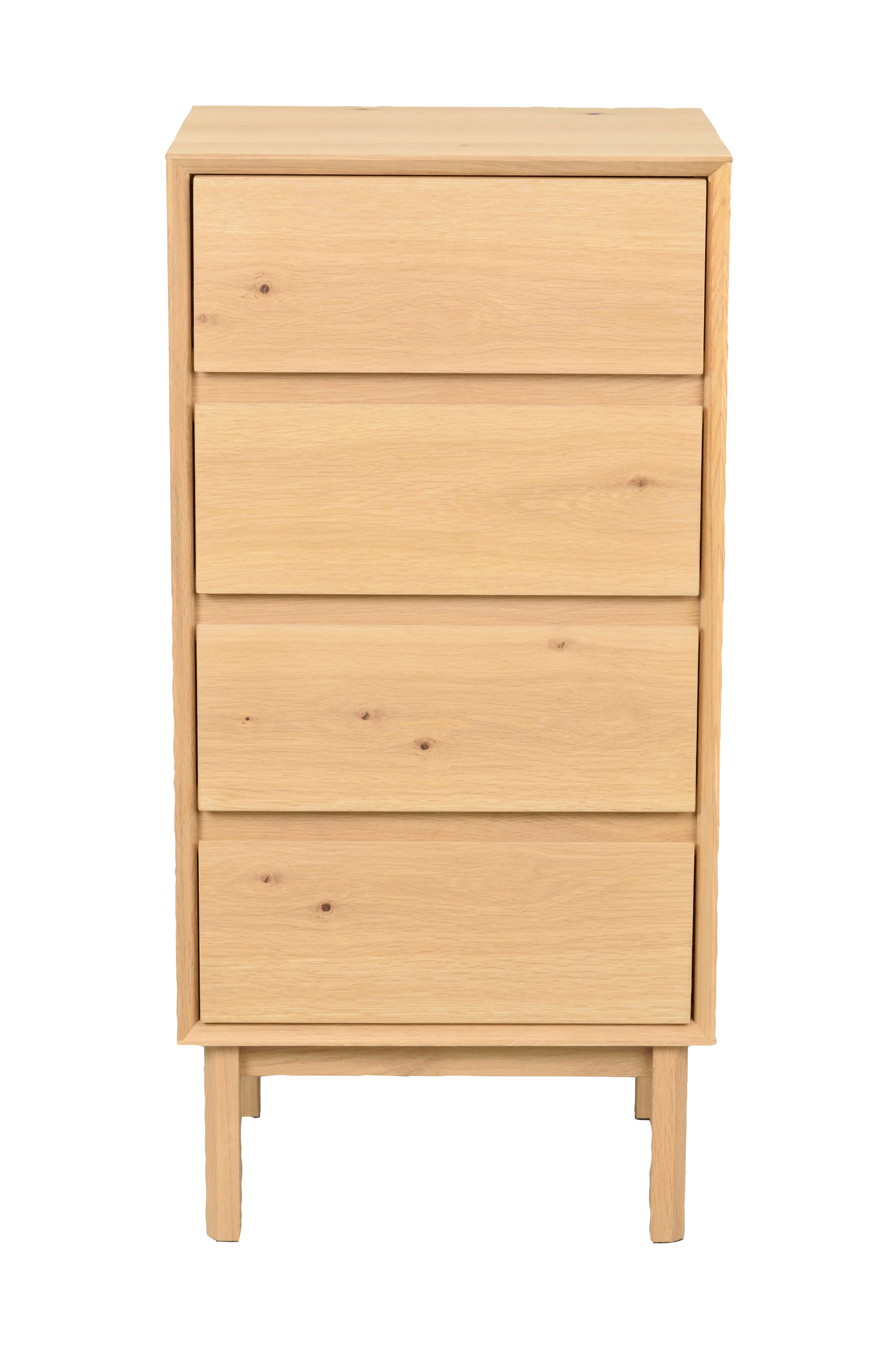 Kommoden Mackay i brun vild ek är ett gediget hantverk med mittsågade hörn och en inramad design runt lådorna, vilket skapar djup och ett härligt skuggspel på möbeln. Byrån är 45 cm bred och har en klassisk design med sina rena linjer, vilket gör den tidlöst hållbar. Den passar lika bra i hallen som i sovrummet. Den vilda eken som används i byrån ger en intressant karaktär till möbelns yta. Mackay finns i tre olika storlekar. Träet i byrån är fsc®-certifierat och finns i alternativen oljad vild ek och brunoljad vild ek.