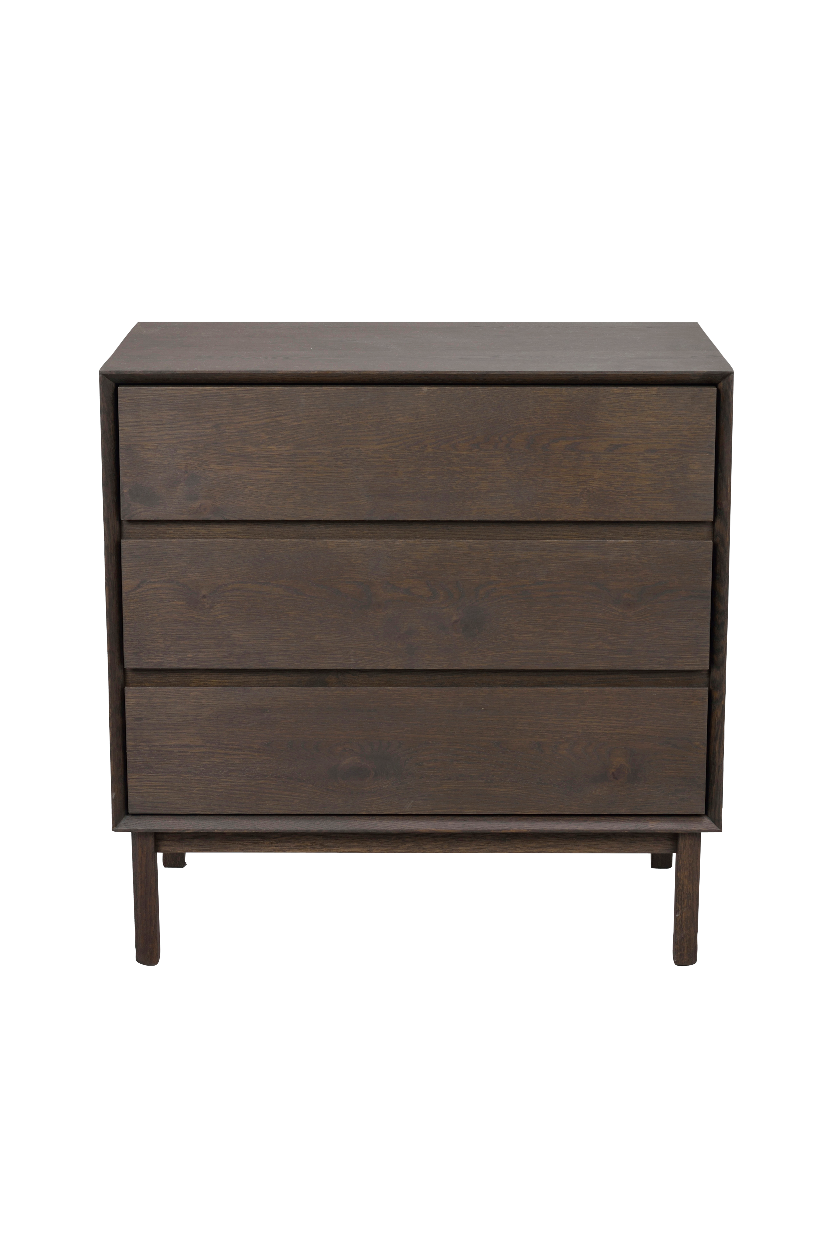 Kommoden Mackay i brun vild ek är ett gediget hantverk med mittsågade hörn och en inramad design runt lådorna, vilket skapar djup och ett härligt skuggspel på möbeln. Byrån är 75 cm bred och har en klassisk design med sina rena linjer, vilket gör den tidlöst hållbar. Den passar lika bra i hallen som i sovrummet. Den vilda eken som används i byrån ger en intressant karaktär till möbelns yta. Mackay finns i tre olika storlekar. Träet i byrån är fsc®-certifierat och finns i alternativen oljad vild ek och brunoljad vild ek.