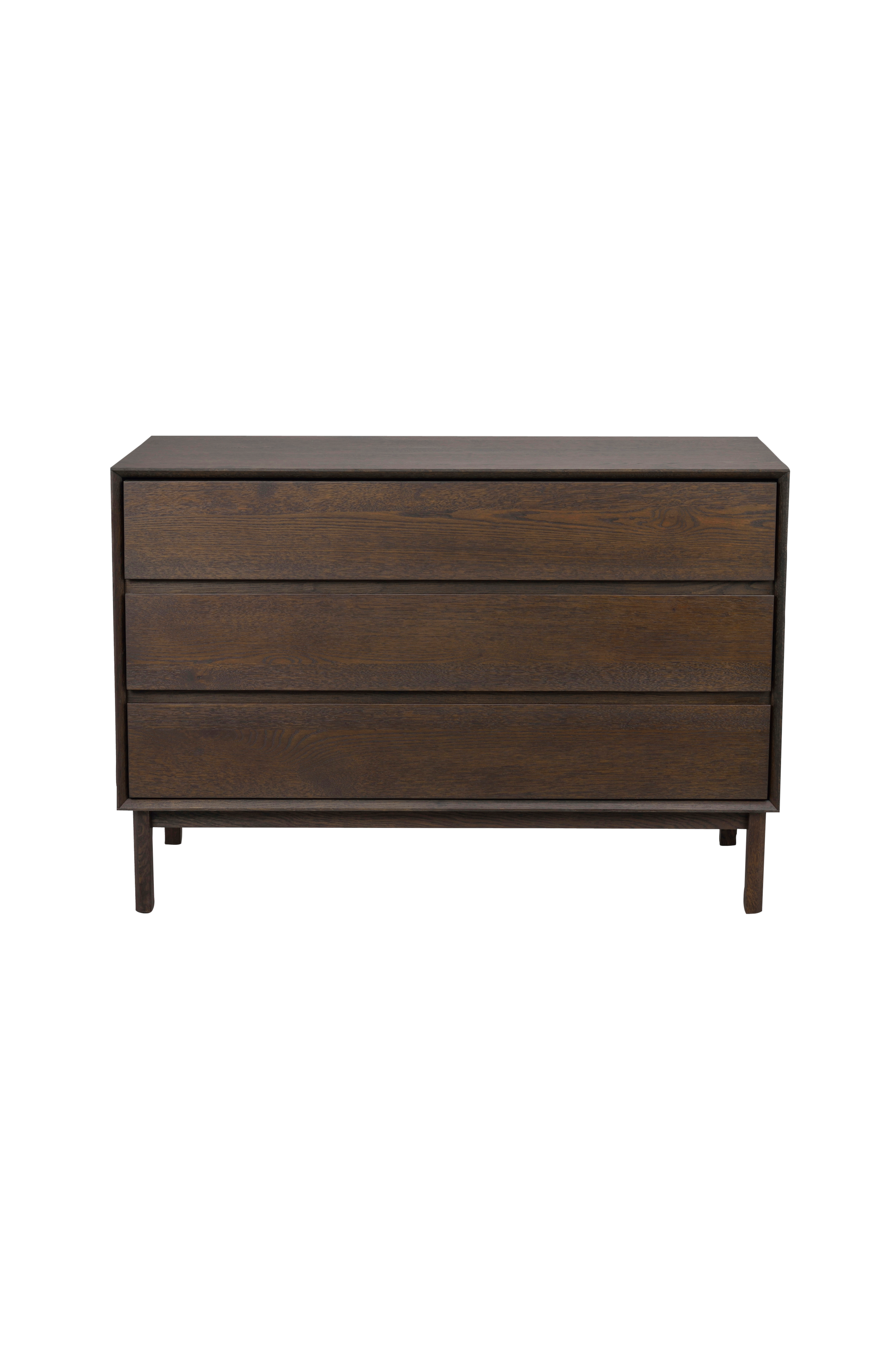 Kommoden Mackay i brun vild ek är ett gediget hantverk med mitrade hörn och en inramad design runt lådorna, vilket skapar djup och ett härligt skuggspel på möbeln. Byrån är 110 cm bred och har en klassisk design med sina rena linjer, vilket gör den tidlöst hållbar. Den passar lika bra i hallen som i sovrummet. Den vilda eken som används i byrån ger en intressant karaktär till möbelns yta. Mackay finns i tre olika storlekar. Träet i byrån är fsc®-certifierat och finns i alternativen oljad vild ek och brunoljad vild ek.