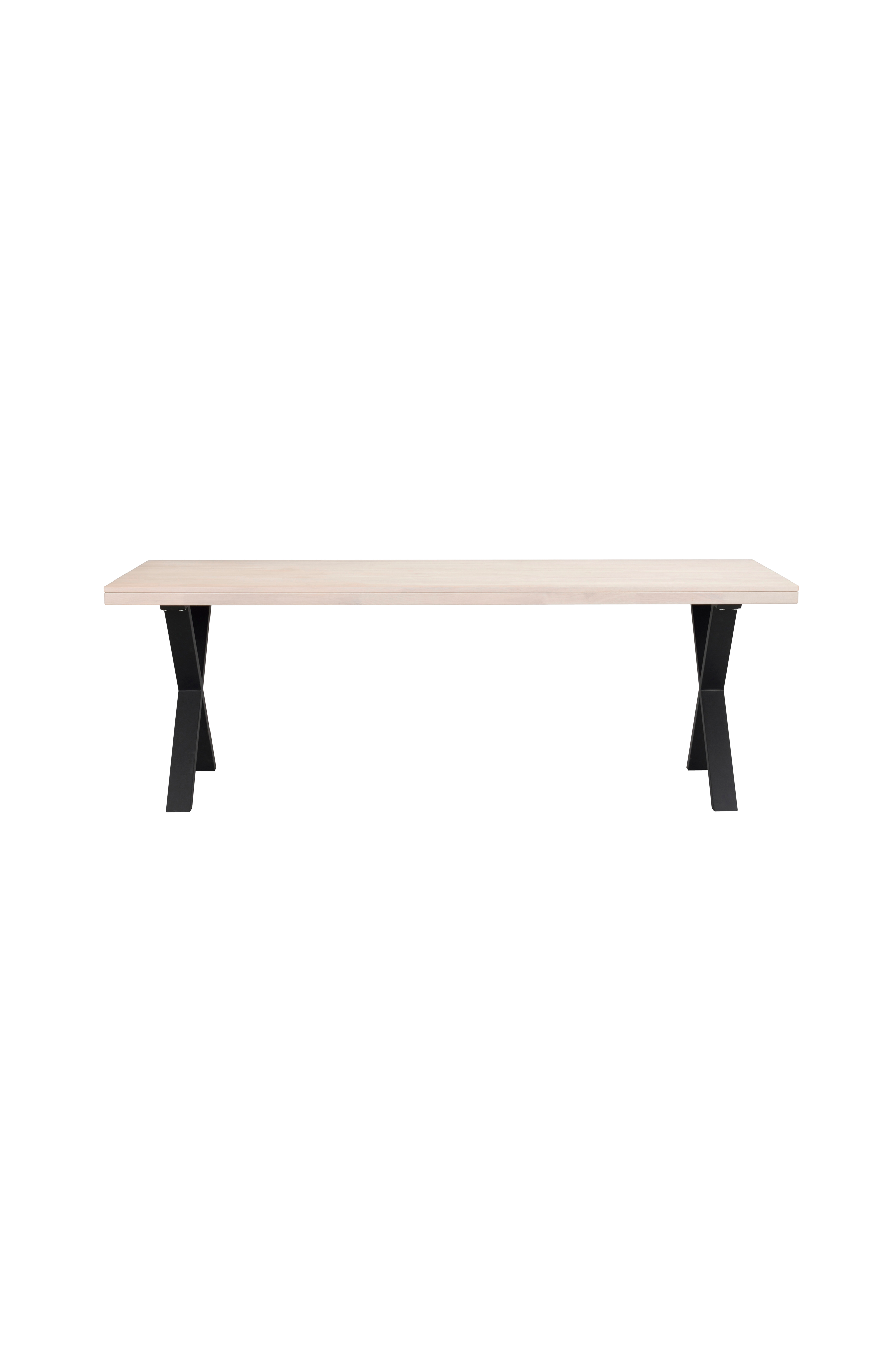 Praktiskt matbord i klassisk design i fingerskarvad vitpigmenterad ek. Längd 220 cm, bredd 95 cm, höjd 75 cm. Bordet kan kompletteras med upp till två tilläggsskivor (ingår ej). Bordsskivan har slät finish och benen är x-formade i svart metall.