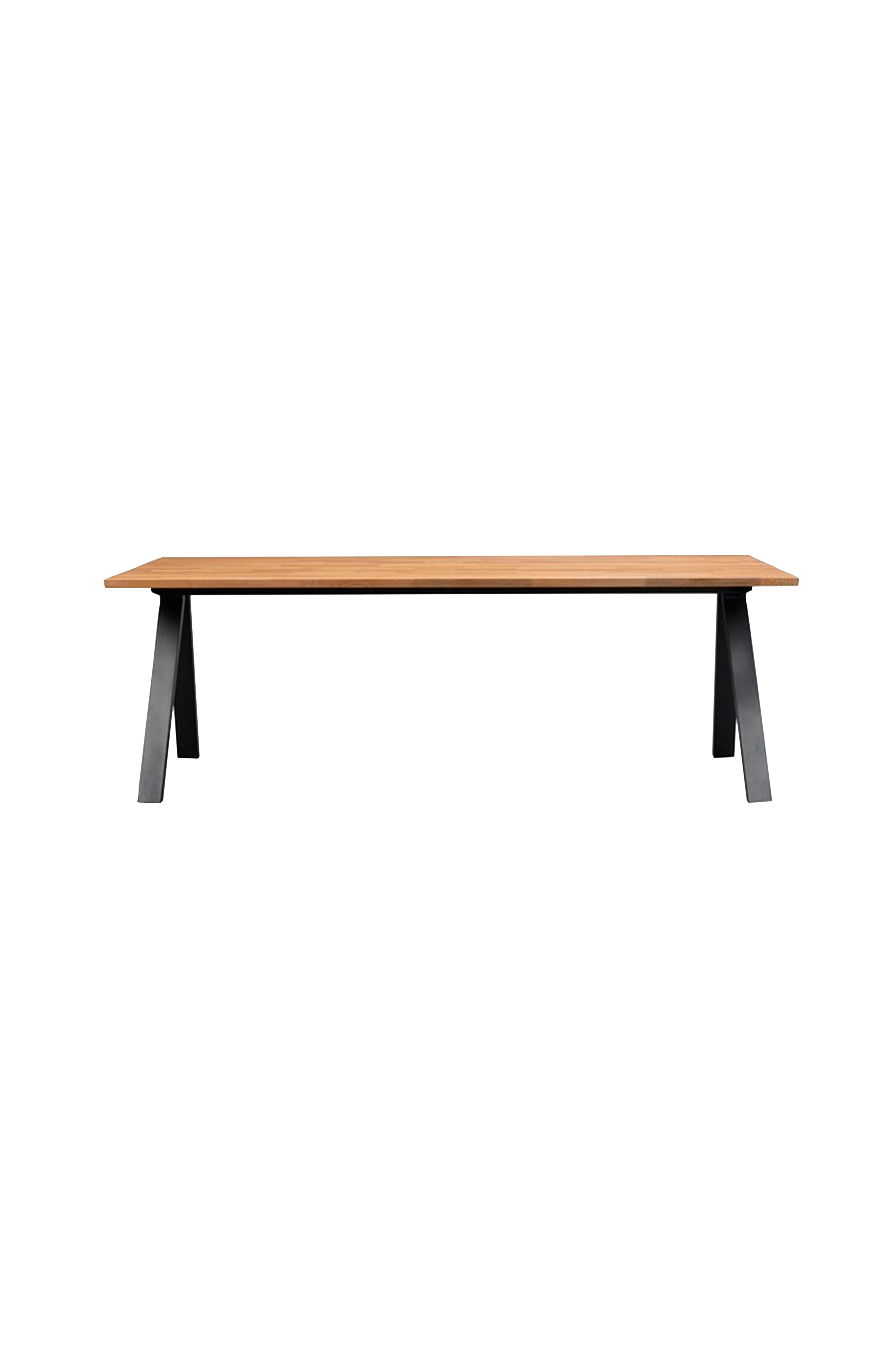 Carradale matbord med tvådelad massiv bordsskiva i ek och V-ben i svart pulverlackad metall. Bordsskivan kan kompletteras med 1 eller 2 tilläggsskivor à 50 cm vilket kan göra bordet upp till 320 cm långt, ingår ej.