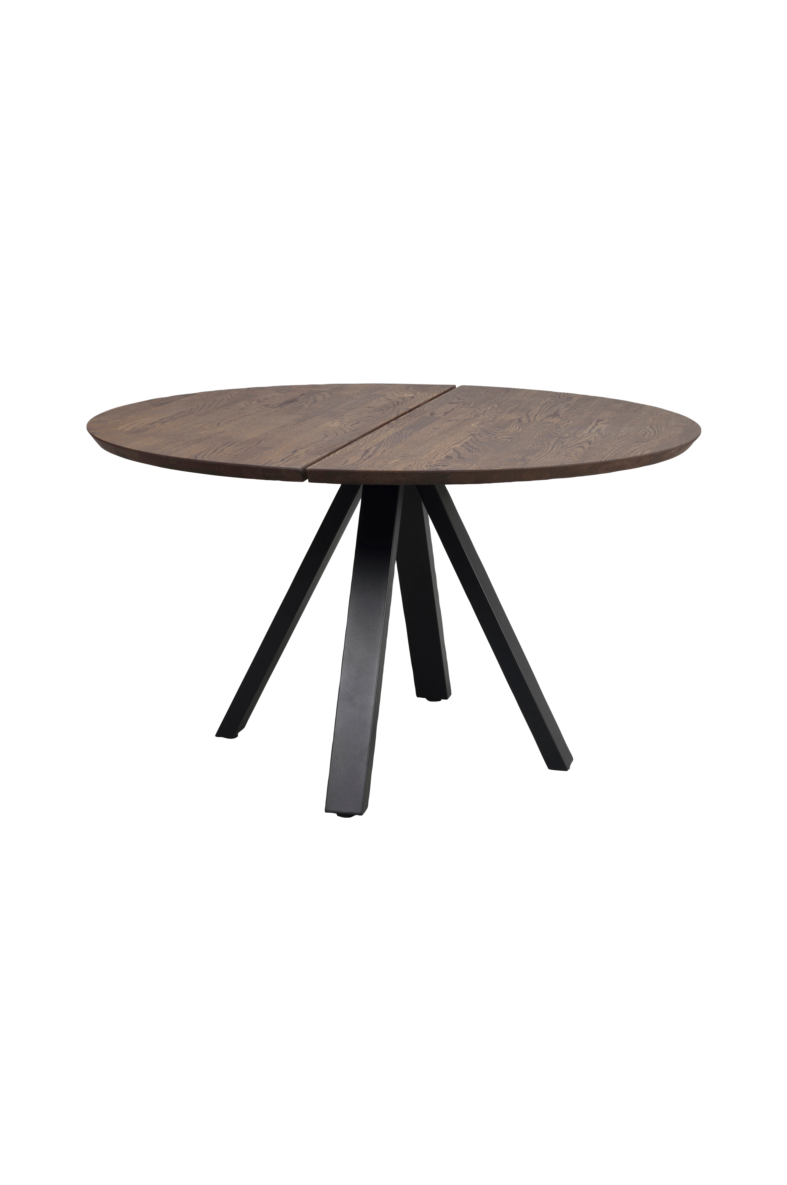 Carradale matbord ø130 i fsc®-certifierad ek. Tvådelad massiv bordsskiva med borstad yta och v-formade ben i pulverlackerad svart metall. Matbordet är en del av den flexibla carradale-serien där du kan designa bordet som du vill ha det genom att välja mellan olika storlekar, former och färger.
