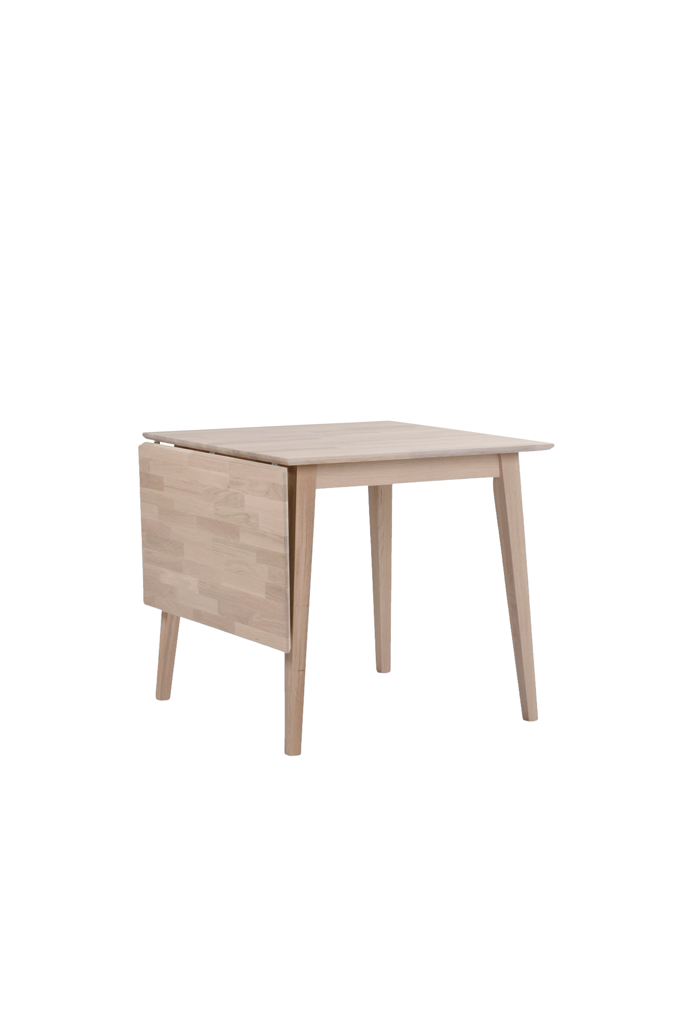 Modernt klaffbord i skandinavisk design i oljad och vitpigmentared ek. 80x80, höjd 74 cm. Bordet är praktisk med en uppfällbar klaff som förlänger bordet från 80 cm till 125 cm. Montera själv.