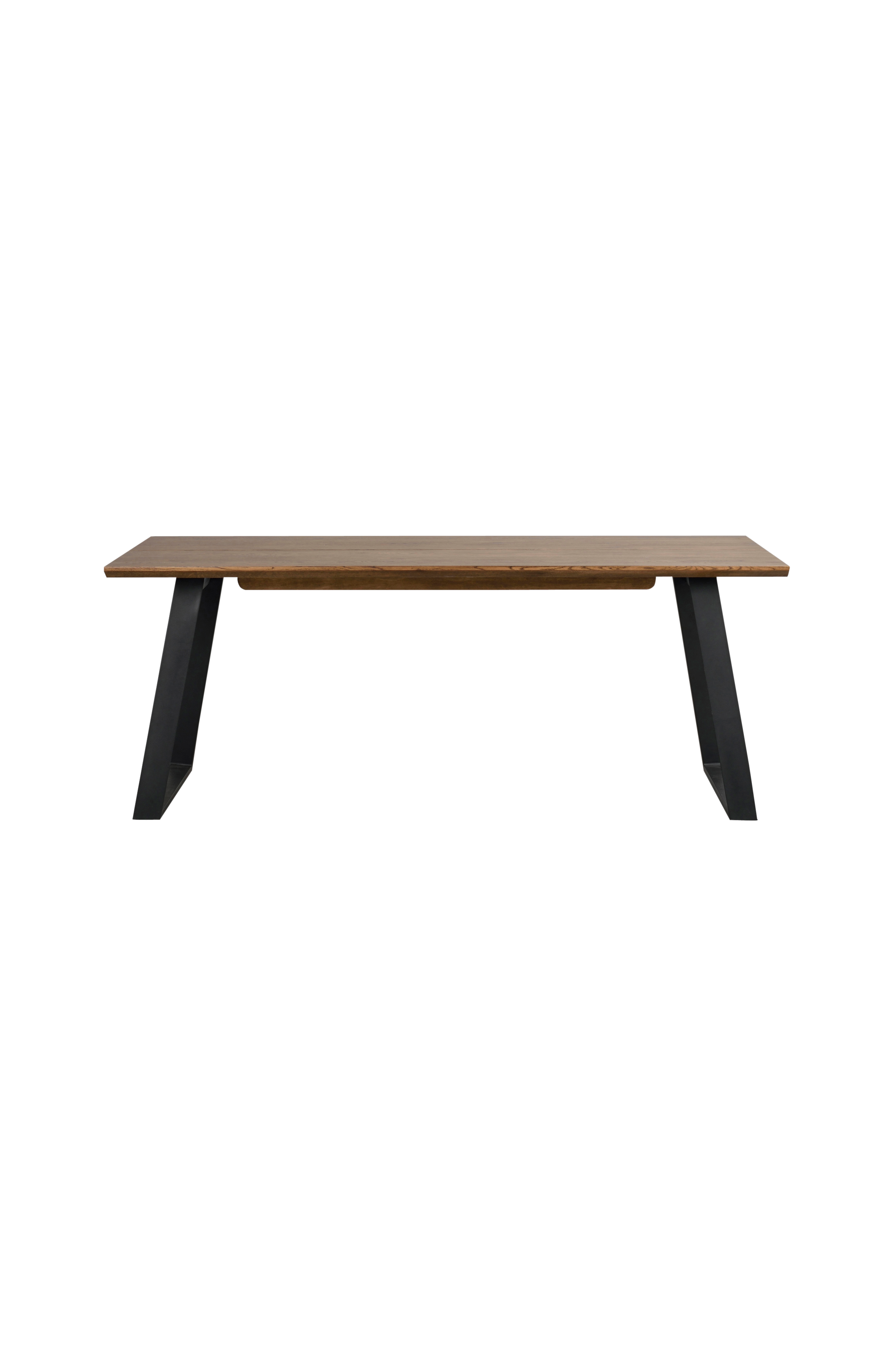 Melville matbord i brun ek med svart metallunderrede. Längd 210 cm, bredd 95 cm, höjd 75 cm. Går att förlänga med en tilläggsskiva på varje kortsida, maxlängd 310 cm. Topp i tjock vild ekfaner med massiva ek kanter och underrede i pulverlackad metall. Bordet ingår i vår serie Melville och är designat av oss på Rowico.